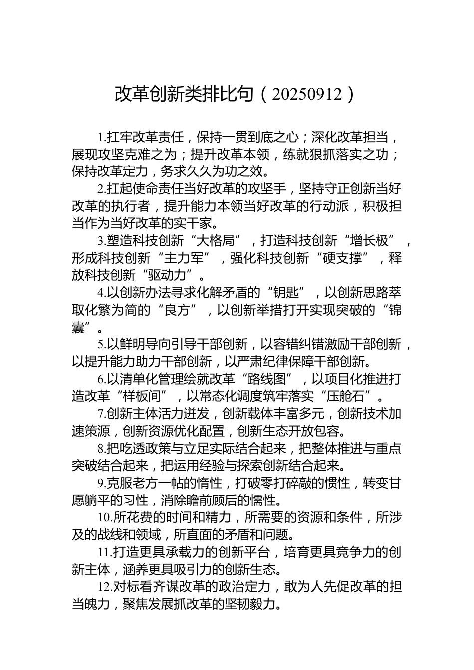 改革創(chuàng)新類排比句(20250912)1.扛牢改革責(zé)任,保持一貫到底之心;深化改革擔(dān)當(dāng),展現(xiàn)攻堅(jiān)克難之為;提升改革本領(lǐng),練就狠抓落實(shí)之功;保持改革定力,務(wù)求久久為功之效。2.扛起使命責(zé)任當(dāng)好改革的攻堅(jiān)手,堅(jiān)持守正創(chuàng)新當(dāng)好改革的執(zhí)行者,提升能力本領(lǐng)當(dāng)好改革的行動(dòng)派,積極擔(dān)當(dāng)作為當(dāng)好改革的實(shí)干家。3.塑造科技創(chuàng)新“大格局”,打造科技創(chuàng)新“增長(zhǎng)極”,形成科技創(chuàng)新“主力軍”,強(qiáng)化科技創(chuàng)新“硬支撐”,釋放科技創(chuàng)新“驅(qū)動(dòng)力”。4.以創(chuàng)新辦法尋求化解矛盾的“鑰匙”,以創(chuàng)新思路萃取化繁為簡(jiǎn)的“良方”,以創(chuàng)新舉措打開(kāi)實(shí)現(xiàn)突破的“錦囊”。5.以鮮明導(dǎo)向引導(dǎo)干部創(chuàng)新...