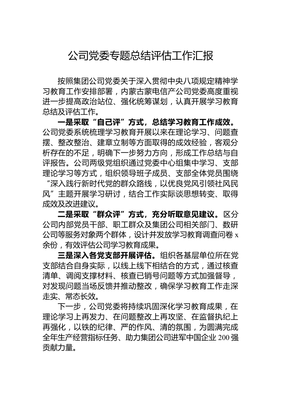 公司黨委八項(xiàng)規(guī)定學(xué)習(xí)教育總結(jié)評(píng)估工作匯報(bào)