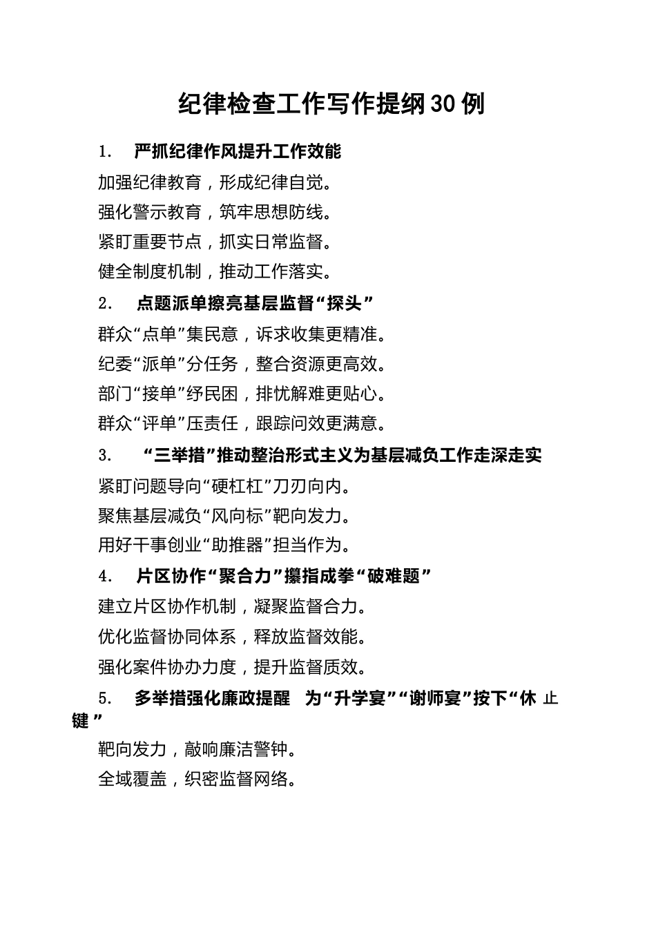 紀(jì)律檢查工作寫(xiě)作提綱30例1.嚴(yán)抓紀(jì)律作風(fēng)提升工作效能加強(qiáng)紀(jì)律教育,形成紀(jì)律自覺(jué)。強(qiáng)化警示教育,筑牢思想防線。緊盯重要節(jié)點(diǎn),抓實(shí)日常監(jiān)督。健全制度機(jī)制,推動(dòng)工作落實(shí)。2.“”點(diǎn)題派單擦亮基層監(jiān)督探頭“”群眾點(diǎn)單集民意,訴求收集更精準(zhǔn)?!啊奔o(jì)委派單分任務(wù),整合資源更高效?!啊辈块T(mén)接單紓民困,排憂(yōu)解難更貼心?!啊比罕娫u(píng)單壓責(zé)任,跟蹤問(wèn)效更滿(mǎn)意。3.“”三舉措推動(dòng)整治形式主義為基層減負(fù)工作走深走實(shí)“”緊盯問(wèn)題導(dǎo)向硬杠杠刀刃向內(nèi)?!啊本劢够鶎訙p負(fù)風(fēng)向標(biāo)靶向發(fā)力?!啊庇煤酶墒聞?chuàng)業(yè)助推器擔(dān)當(dāng)作為。4.“”“”片區(qū)協(xié)作聚合力攥指成拳破難題建立片區(qū)協(xié)...
