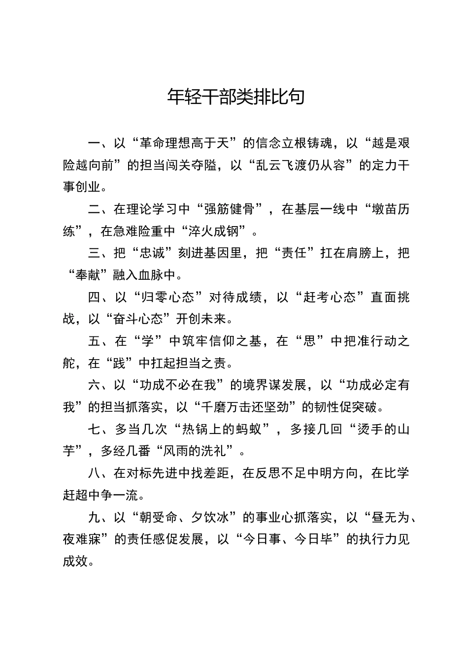 年輕干部類排比句一、以“革命理想高于天”的信念立根鑄魂,以“越是艱險越向前”的擔當闖關(guān)奪隘,以“亂云飛渡仍從容”的定力干事創(chuàng)業(yè)。二、在理論學(xué)習中“強筋健骨”,在基層一線中“墩苗歷練”,在急難險重中“淬火成鋼”。三、把“忠誠”刻進基因里,把“責任”扛在肩膀上,把“奉獻”融入血脈中。四、以“歸零心態(tài)”對待成績,以“趕考心態(tài)”直面挑戰(zhàn),以“奮斗心態(tài)”開創(chuàng)未來。五、在“學(xué)”中筑牢信仰之基,在“思”中把準行動之舵,在“踐”中扛起擔當之責。六、以“功成不必在我”的境界謀發(fā)展,以“功成必定有我”的擔當抓落實,以“千磨萬擊還堅勁”的韌性促突...