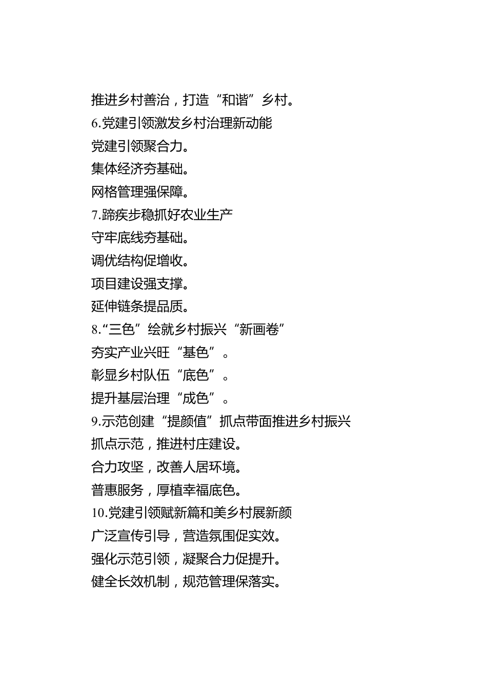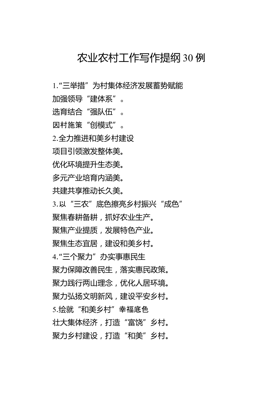 農(nóng)業(yè)農(nóng)村工作寫作提綱30例1.“三舉措”為村集體經(jīng)濟發(fā)展蓄勢賦能加強領(lǐng)導(dǎo)“建體系”。選育結(jié)合“強隊伍”。因村施策“創(chuàng)模式”。2.全力推進和美鄉(xiāng)村建設(shè)項目引領(lǐng)激發(fā)整體美。優(yōu)化環(huán)境提升生態(tài)美。多元產(chǎn)業(yè)培育內(nèi)涵美。共建共享推動長久美。3.以“三農(nóng)”底色擦亮鄉(xiāng)村振興“成色”聚焦春耕備耕,抓好農(nóng)業(yè)生產(chǎn)。聚焦產(chǎn)業(yè)提質(zhì),發(fā)展特色產(chǎn)業(yè)。聚焦生態(tài)宜居,建設(shè)和美鄉(xiāng)村。4.“三個聚力”辦實事惠民生聚力保障改善民生,落實惠民政策。聚力踐行兩山理念,優(yōu)化人居環(huán)境。聚力弘揚文明新風,建設(shè)平安鄉(xiāng)村。5.繪就“和美鄉(xiāng)村”幸福底色壯大集體經(jīng)濟,打造“富饒”鄉(xiāng)村。聚力鄉(xiāng)村...