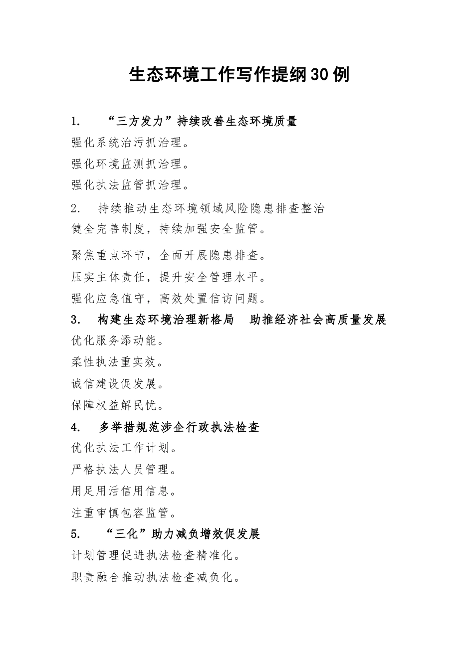 生態(tài)環(huán)境工作寫作提綱30例1.“三方發(fā)力”持續(xù)改善生態(tài)環(huán)境質(zhì)量強(qiáng)化系統(tǒng)治污抓治理。強(qiáng)化環(huán)境監(jiān)測抓治理。強(qiáng)化執(zhí)法監(jiān)管抓治理。2.持續(xù)推動生態(tài)環(huán)境領(lǐng)域風(fēng)險隱患排查整治健全完善制度,持續(xù)加強(qiáng)安全監(jiān)管。聚焦重點(diǎn)環(huán)節(jié),全面開展隱患排查。壓實(shí)主體責(zé)任,提升安全管理水平。強(qiáng)化應(yīng)急值守,高效處置信訪問題。3.構(gòu)建生態(tài)環(huán)境治理新格局助推經(jīng)濟(jì)社會高質(zhì)量發(fā)展優(yōu)化服務(wù)添動能。柔性執(zhí)法重實(shí)效。誠信建設(shè)促發(fā)展。保障權(quán)益解民憂。4.多舉措規(guī)范涉企行政執(zhí)法檢查優(yōu)化執(zhí)法工作計劃。嚴(yán)格執(zhí)法人員管理。用足用活信用信息。注重審慎包容監(jiān)管。5.“三化”助力減負(fù)增效促發(fā)展計劃管理...