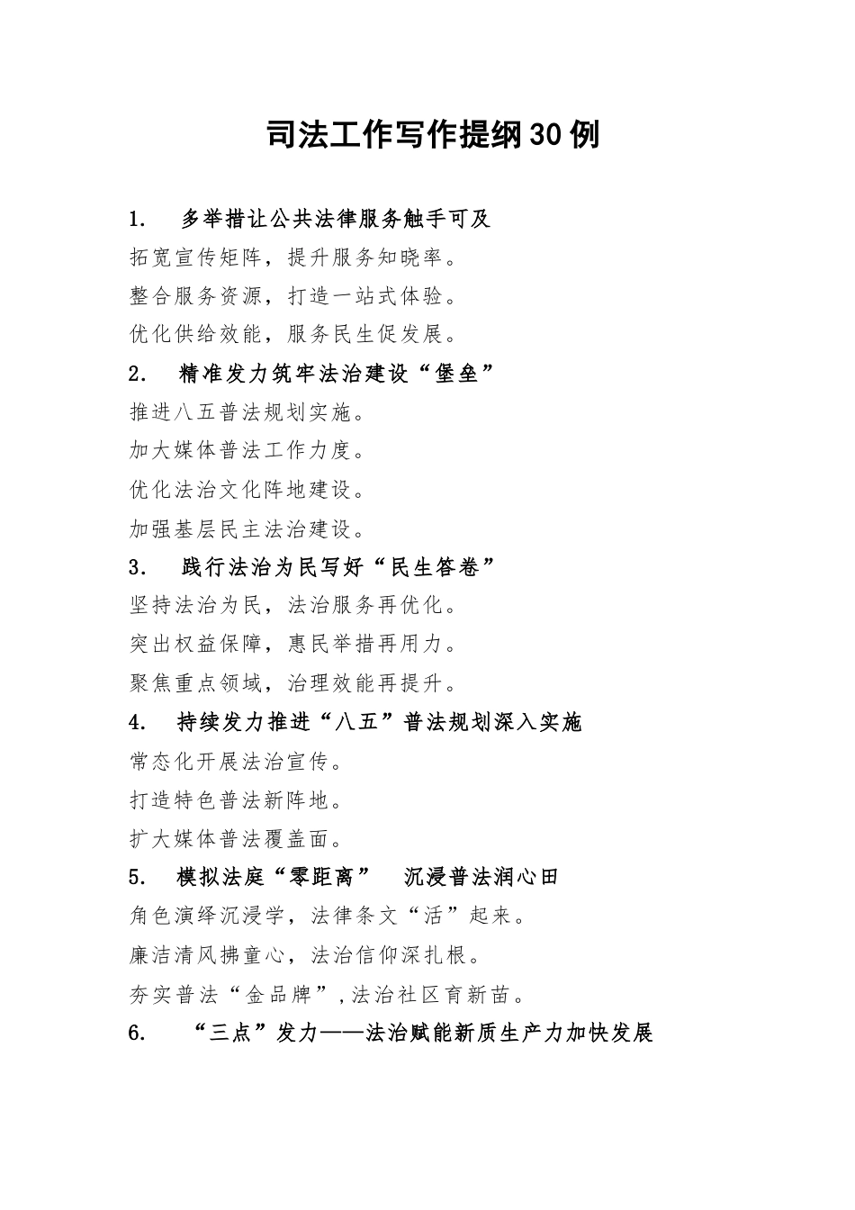 司法工作寫作提綱30例1.多舉措讓公共法律服務(wù)觸手可及拓寬宣傳矩陣,提升服務(wù)知曉率。整合服務(wù)資源,打造一站式體驗。優(yōu)化供給效能,服務(wù)民生促發(fā)展。2.精準(zhǔn)發(fā)力筑牢法治建設(shè)“堡壘”推進八五普法規(guī)劃實施。加大媒體普法工作力度。優(yōu)化法治文化陣地建設(shè)。加強基層民主法治建設(shè)。3.踐行法治為民寫好“民生答卷”堅持法治為民,法治服務(wù)再優(yōu)化。突出權(quán)益保障,惠民舉措再用力。聚焦重點領(lǐng)域,治理效能再提升。4.持續(xù)發(fā)力推進“八五”普法規(guī)劃深入實施常態(tài)化開展法治宣傳。打造特色普法新陣地。擴大媒體普法覆蓋面。5.模擬法庭“零距離”沉浸普法潤心田角色演繹沉浸學(xué),法律...