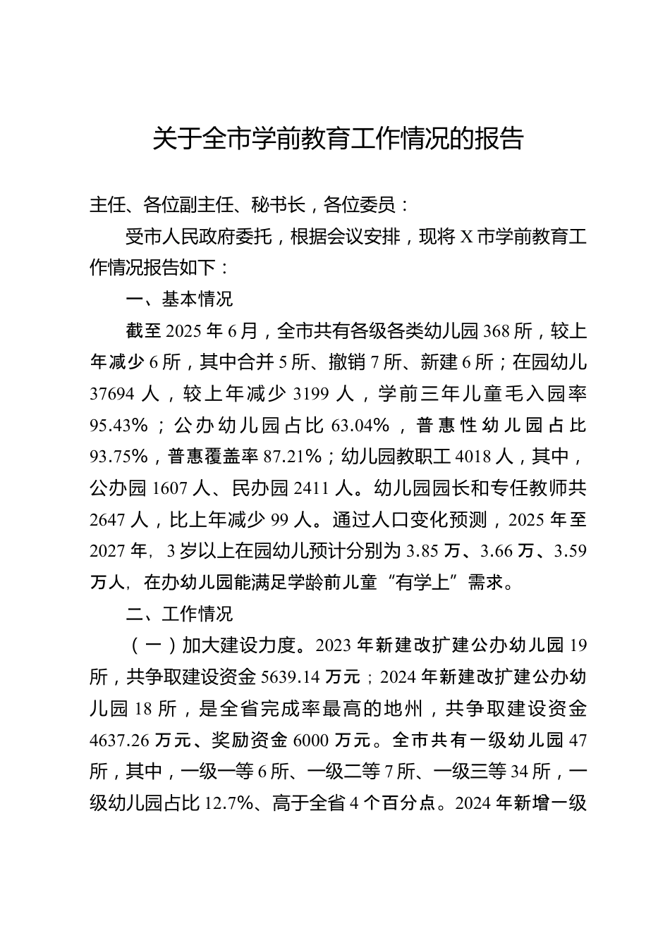 關(guān)于全市學(xué)前教育工作情況的報告主任、各位副主任、秘書長,各位委員:受市人民政府委托,根據(jù)會議安排,現(xiàn)將X市學(xué)前教育工作情況報告如下:一、基本情況截至2025年6月,全市共有各級各類幼兒園368所,較上年減少6所,其中合并5所、撤銷7所、新建6所;在園幼兒37694人,較上年減少3199人,學(xué)前三年兒童毛入園率95.43%;公辦幼兒園占比63.04%,普惠性幼兒園占比93.75%,普惠覆蓋率87.21%;幼兒園教職工4018人,其中,公辦園1607人、民辦園2411人。幼兒園園長和專任教師共2647人,比上年減少99人。通過人口變化預(yù)測,2025年至2027年,3歲以上在園幼兒預(yù)計分別為3.85萬、3.6...