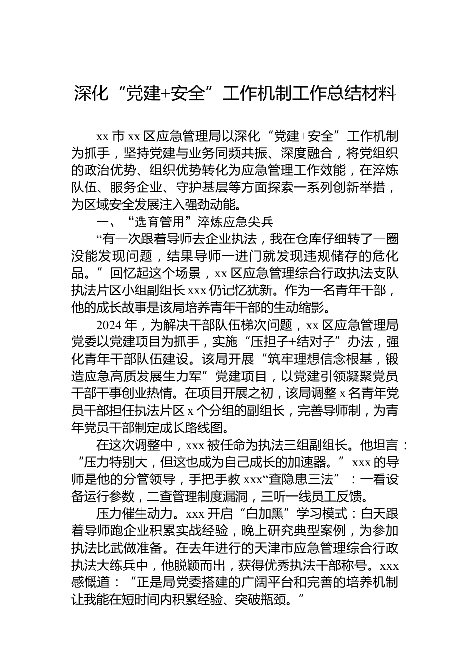基層黨建工作總結(jié)材料匯編(3篇)目錄1.深化“黨建+安全”工作機制工作總結(jié)材料..........................22.加強基層黨建工作總結(jié)材料..................................................73.推動黨建與業(yè)務融合工作總結(jié)材料....................................13深化“黨建+安全”工作機制工作總結(jié)材料xx市xx區(qū)應急管理局以深化“黨建+安全”工作機制為抓手,堅持黨建與業(yè)務同頻共振、深度融合,將黨組織的政治優(yōu)勢、組織優(yōu)勢轉(zhuǎn)化為應急管理工作效能,在淬煉隊伍、服務企業(yè)、守護基層等方面探索一系列創(chuàng)新舉措,為區(qū)域安全發(fā)展注入強勁動能。一、“選育管用”淬煉應...
