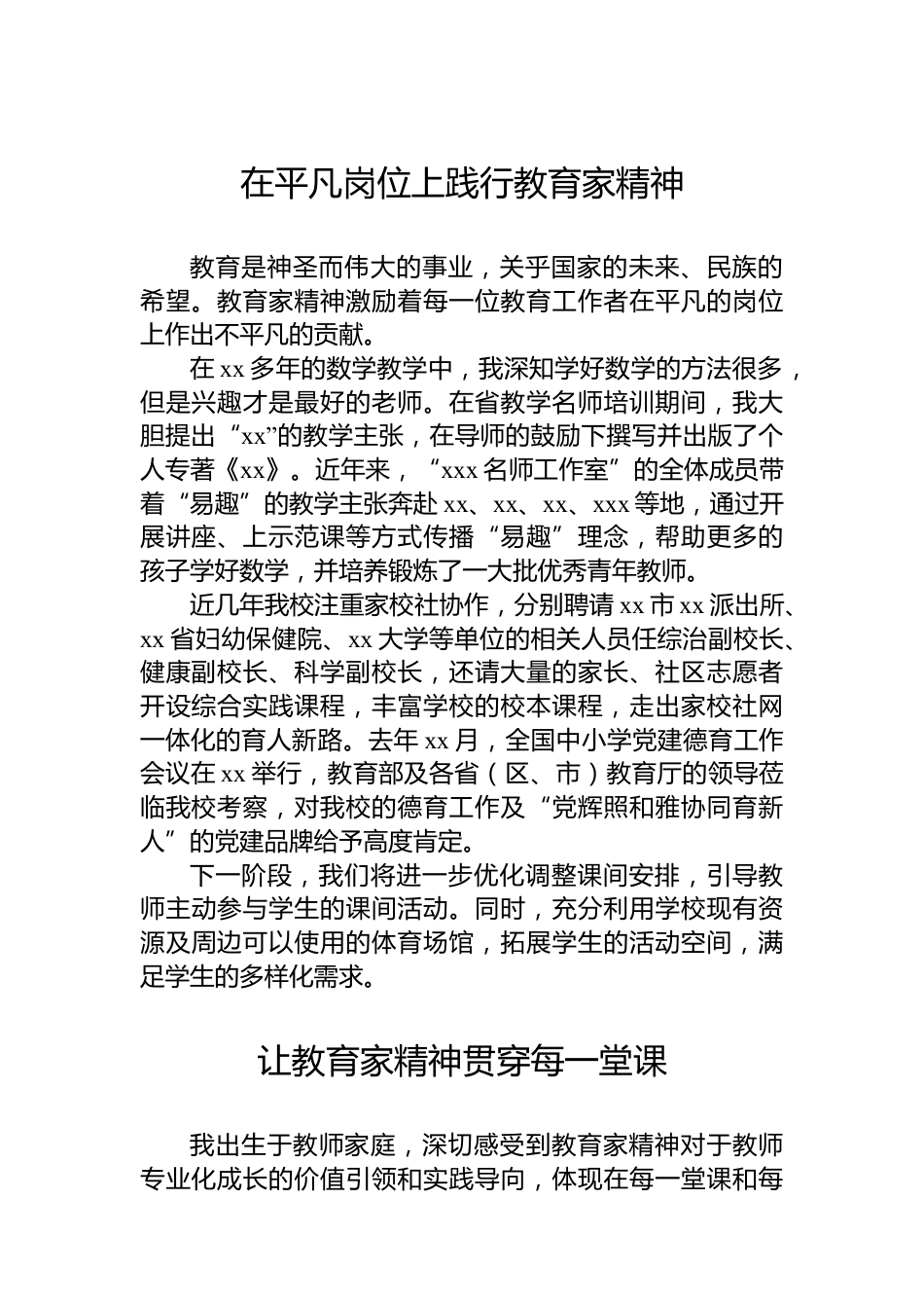 教師代表在全市慶祝第xx個(gè)教師節(jié)茶話會(huì)上的發(fā)言材料匯編(7篇)目錄1.在平凡崗位上踐行教育家精神................................................22.讓教育家精神貫穿每一堂課..................................................43.努力成為教育家型教師..........................................................64.為特殊兒童鋪設(shè)一條希望之路..............................................85.三代人傳承創(chuàng)新,詮釋教育家精神....................................106.塑造全面發(fā)展的個(gè)體............................................................117.讓...