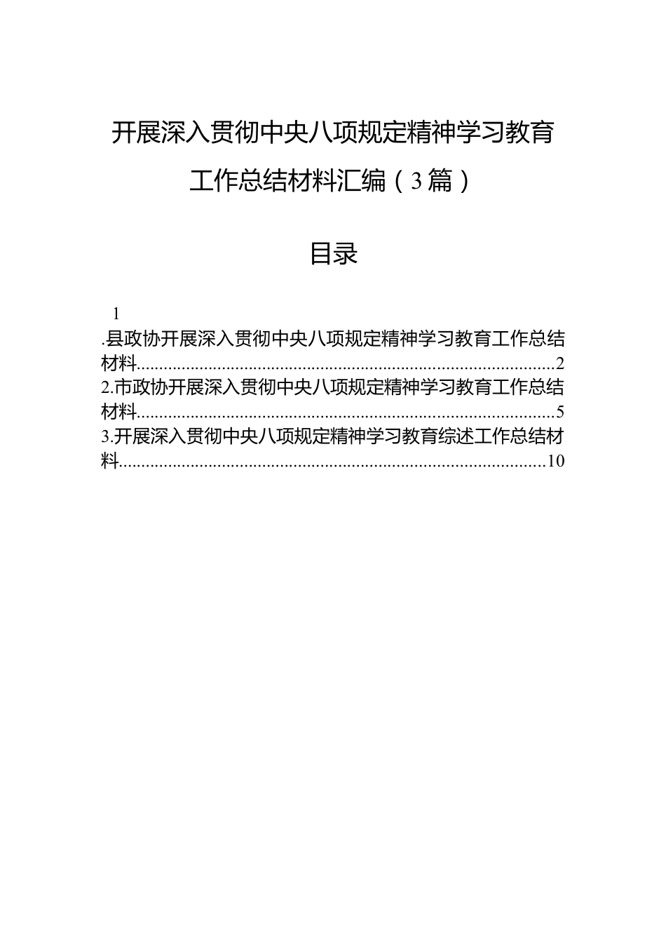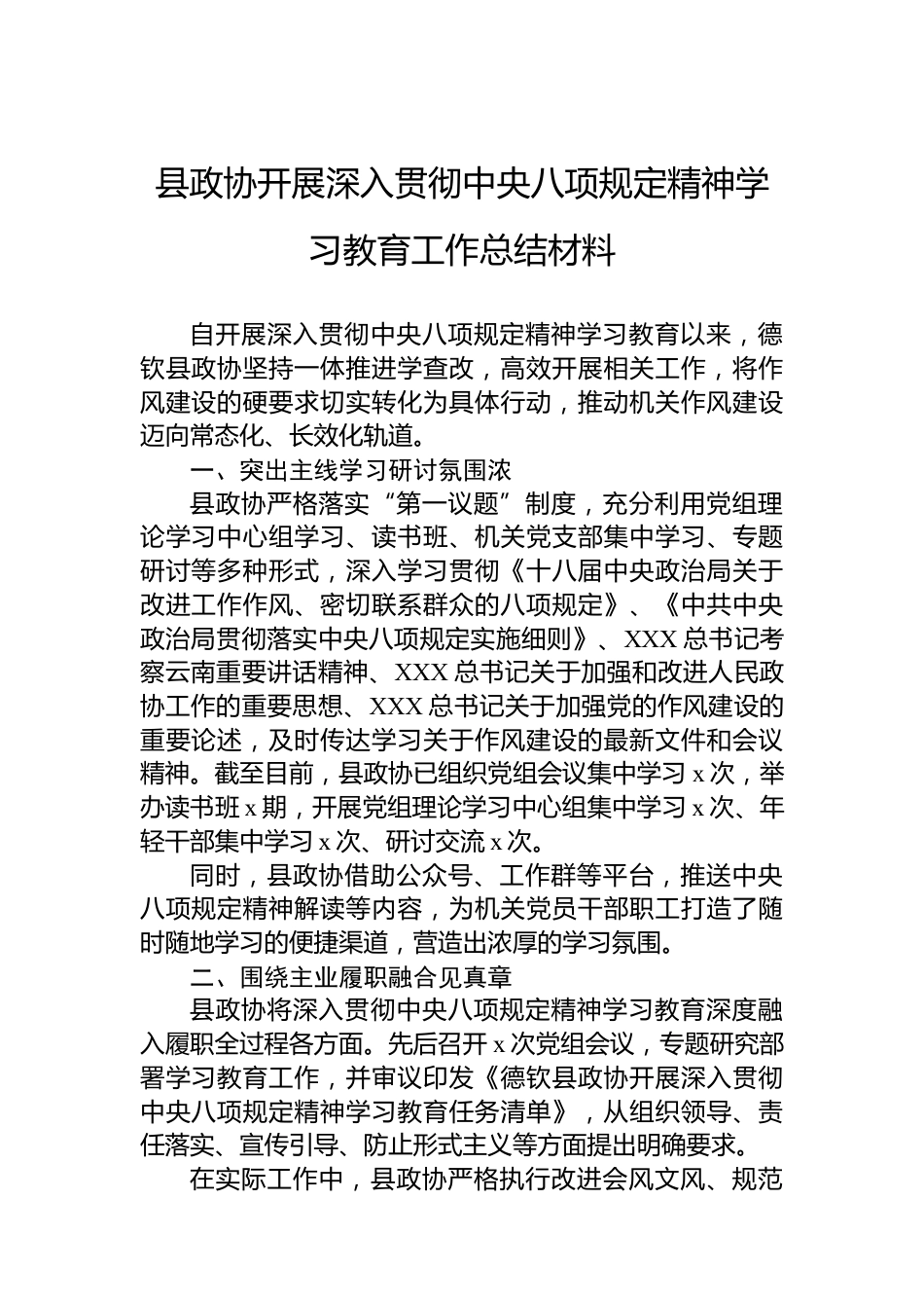 開(kāi)展深入貫徹中央八項(xiàng)規(guī)定精神學(xué)習(xí)教育工作總結(jié)材料匯編(3篇)目錄1.縣政協(xié)開(kāi)展深入貫徹中央八項(xiàng)規(guī)定精神學(xué)習(xí)教育工作總結(jié)材料.............................................................................................22.市政協(xié)開(kāi)展深入貫徹中央八項(xiàng)規(guī)定精神學(xué)習(xí)教育工作總結(jié)材料.............................................................................................53.開(kāi)展深入貫徹中央八項(xiàng)規(guī)定精神學(xué)習(xí)教育綜述工作總結(jié)材料...............................................................................................10縣政協(xié)開(kāi)展深入貫...