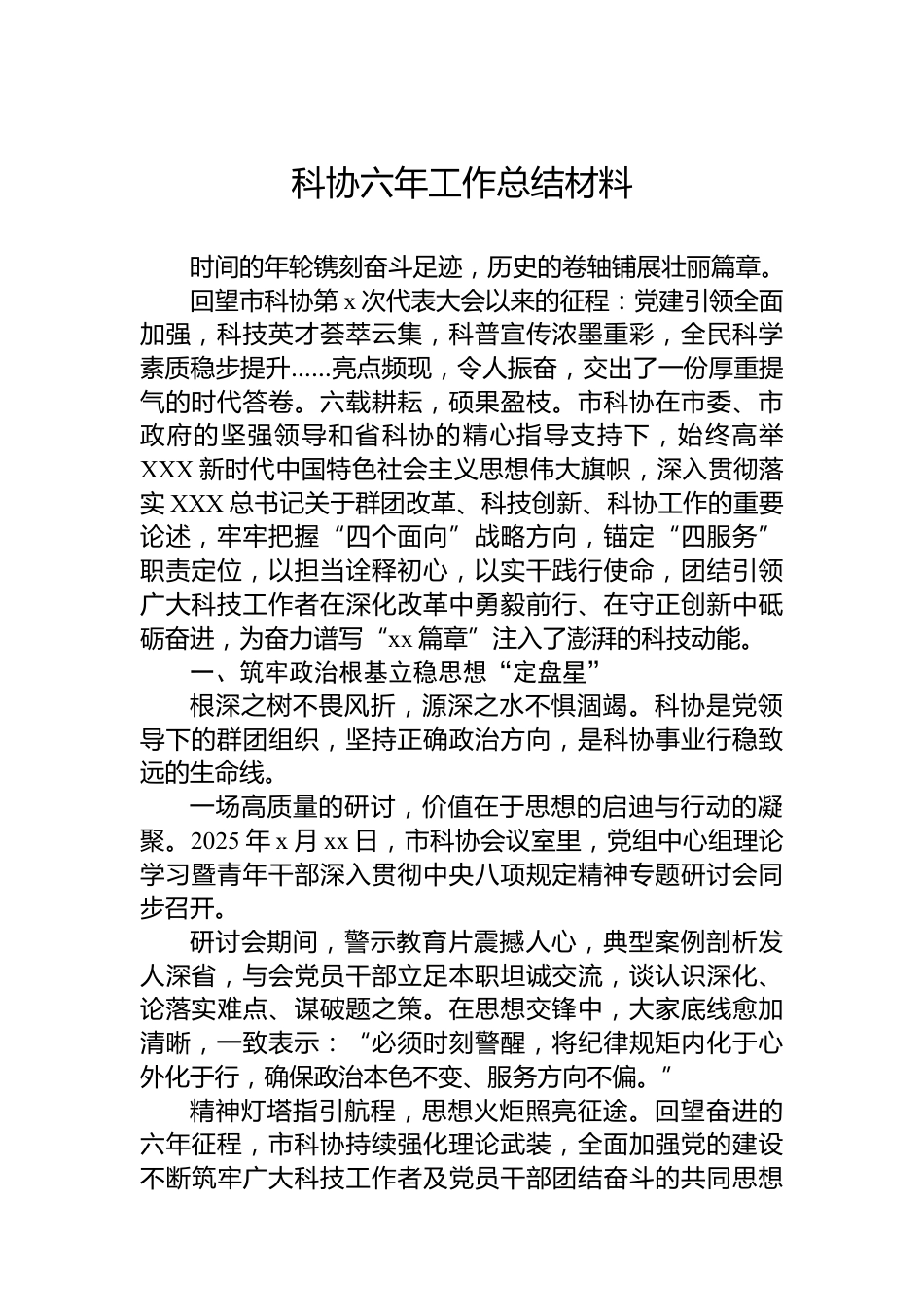 科協(xié)六年工作總結材料時間的年輪鐫刻奮斗足跡,歷史的卷軸鋪展壯麗篇章?;赝锌茀f(xié)第x次代表大會以來的征程:黨建引領全面加強,科技英才薈萃云集,科普宣傳濃墨重彩,全民科學素質穩(wěn)步提升……亮點頻現(xiàn),令人振奮,交出了一份厚重提氣的時代答卷。六載耕耘,碩果盈枝。市科協(xié)在市委、市政府的堅強領導和省科協(xié)的精心指導支持下,始終高舉XXX新時代中國特色社會主義思想偉大旗幟,深入貫徹落實XXX總書記關于群團改革、科技創(chuàng)新、科協(xié)工作的重要論述,牢牢把握“四個面向”戰(zhàn)略方向,錨定“四服務”職責定位,以擔當詮釋初心,以實干踐行使命,團結引領廣大科技工作者在...