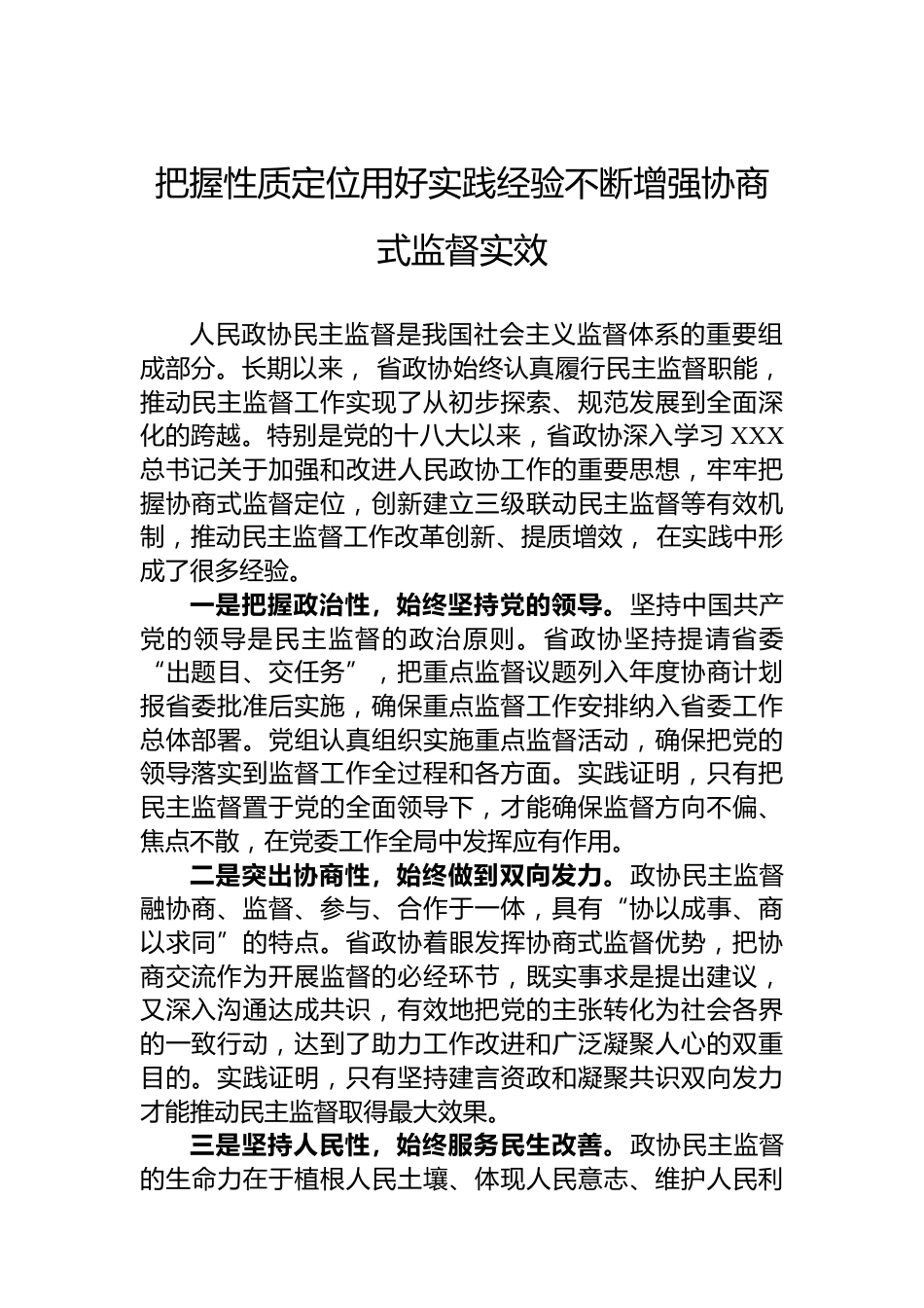 慶祝陜西省政協(xié)成立75周年理論研討會(huì)發(fā)言材料匯編(6篇)目錄1.把握性質(zhì)定位用好實(shí)踐經(jīng)驗(yàn)不斷增強(qiáng)協(xié)商式監(jiān)督實(shí)效22.傳承中華優(yōu)秀傳統(tǒng)文化譜寫政協(xié)事業(yè)發(fā)展新篇.......43.深刻把握人民政協(xié)制度優(yōu)勢(shì)有效發(fā)揮人民政協(xié)職能作用............................................................................64.新時(shí)代人民政協(xié)為人民的陜西實(shí)踐.......................85.用好人民政協(xié)平臺(tái)更好發(fā)揮參政黨作用..............106.站穩(wěn)人民立場(chǎng)做心中有群眾的政協(xié)委員..............12把握性質(zhì)定位用好實(shí)踐經(jīng)驗(yàn)不斷增強(qiáng)協(xié)商式監(jiān)督實(shí)效人民政協(xié)民主監(jiān)督是我國(guó)社會(huì)主義監(jiān)督體系的...
