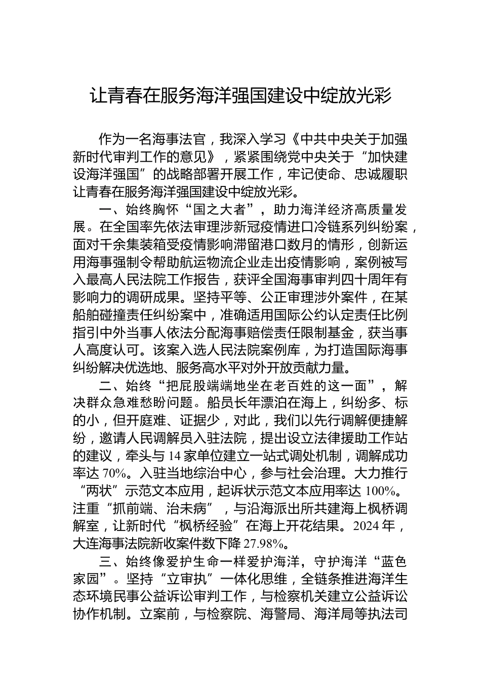 讓青春在服務(wù)海洋強國建設(shè)中綻放光彩作為一名海事法官,我深入學(xué)習(xí)《中共中央關(guān)于加強新時代審判工作的意見》,緊緊圍繞黨中央關(guān)于“加快建設(shè)海洋強國”的戰(zhàn)略部署開展工作,牢記使命、忠誠履職讓青春在服務(wù)海洋強國建設(shè)中綻放光彩。一、始終胸懷“國之大者”,助力海洋經(jīng)濟高質(zhì)量發(fā)展。在全國率先依法審理涉新冠疫情進口冷鏈系列糾紛案,面對千余集裝箱受疫情影響滯留港口數(shù)月的情形,創(chuàng)新運用海事強制令幫助航運物流企業(yè)走出疫情影響,案例被寫入最高人民法院工作報告,獲評全國海事審判四十周年有影響力的調(diào)研成果。堅持平等、公正審理涉外案件,在某船舶碰撞責(zé)任糾紛...