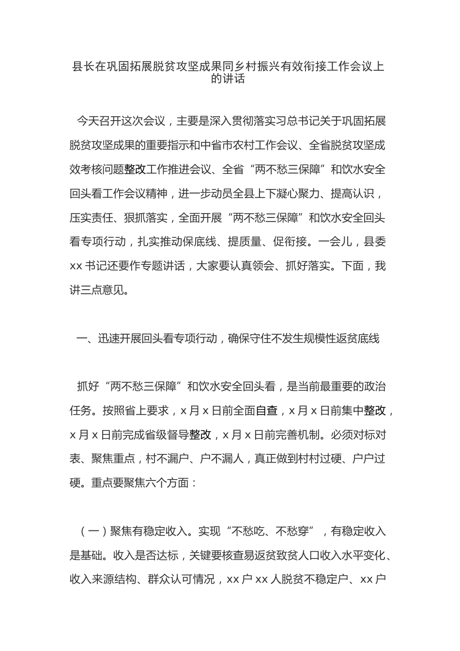 縣長(zhǎng)在鞏固拓展脫貧攻堅(jiān)成果同鄉(xiāng)村振興有效銜接工作會(huì)議上的講話今天召開(kāi)這次會(huì)議,主要是深入貫徹落實(shí)習(xí)總書(shū)記關(guān)于鞏固拓展脫貧攻堅(jiān)成果的重要指示和中省市農(nóng)村工作會(huì)議、全省脫貧攻堅(jiān)成效考核問(wèn)題整改工作推進(jìn)會(huì)議、全省“兩不愁三保障”和飲水安全回頭看工作會(huì)議精神,進(jìn)一步動(dòng)員全縣上下凝心聚力、提高認(rèn)識(shí),壓實(shí)責(zé)任、狠抓落實(shí),全面開(kāi)展“兩不愁三保障”和飲水安全回頭看專項(xiàng)行動(dòng),扎實(shí)推動(dòng)保底線、提質(zhì)量、促銜接。一會(huì)兒,縣委xx書(shū)記還要作專題講話,大家要認(rèn)真領(lǐng)會(huì)、抓好落實(shí)。下面,我講三點(diǎn)意見(jiàn)。一、迅速開(kāi)展回頭看專項(xiàng)行動(dòng),確保守住不發(fā)生規(guī)模性返貧底線抓...