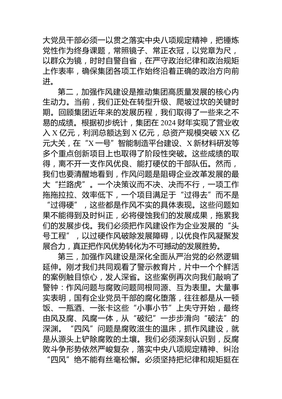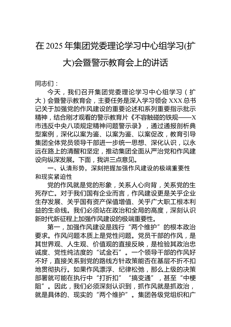 在2025年集團(tuán)黨委理論學(xué)習(xí)中心組學(xué)習(xí)(擴(kuò)大)會(huì)暨警示教育會(huì)上的講話同志們:今天,我們召開(kāi)集團(tuán)黨委理論學(xué)習(xí)中心組學(xué)習(xí)(擴(kuò)大)會(huì)暨警示教育會(huì),主要任務(wù)是深入學(xué)習(xí)領(lǐng)會(huì)XXX總書(shū)記關(guān)于加強(qiáng)黨的作風(fēng)建設(shè)的重要論述和系列重要指示批示精神,結(jié)合剛才觀看的警示教育片《不容觸碰的鐵規(guī)——X市違反中央八項(xiàng)規(guī)定精神問(wèn)題警示錄》,通過(guò)通報(bào)剖析典型案例,深化以案為鑒、以案為鑒、以案促改,教育引導(dǎo)集團(tuán)全體黨員領(lǐng)導(dǎo)干部進(jìn)一步統(tǒng)一思想、深化認(rèn)識(shí),以永遠(yuǎn)在路上的清醒和堅(jiān)定,推動(dòng)集團(tuán)全面從嚴(yán)治黨和作風(fēng)建設(shè)向縱深發(fā)展。下面,我講三點(diǎn)意見(jiàn)。一、認(rèn)清形勢(shì),深刻把握加強(qiáng)作風(fēng)建...