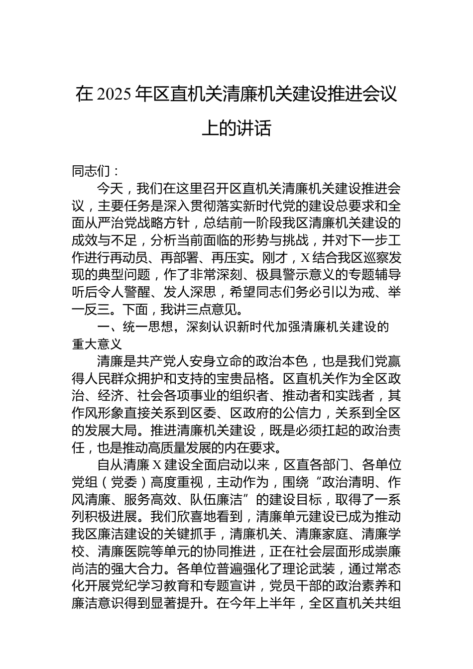 在2025年區(qū)直機(jī)關(guān)清廉機(jī)關(guān)建設(shè)推進(jìn)會(huì)議上的講話(huà)