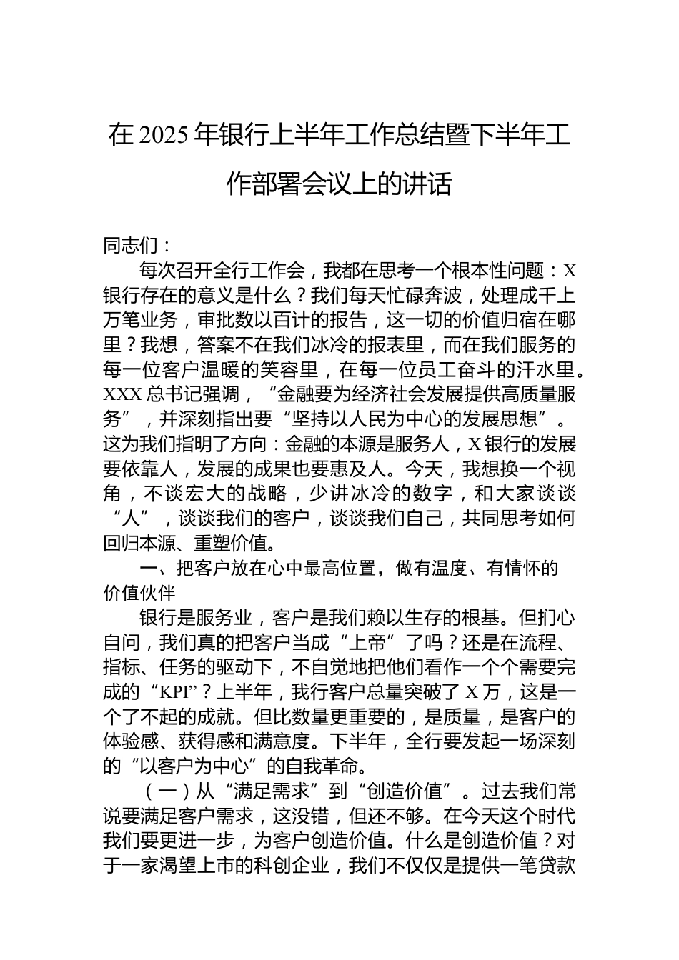 在2025年銀行上半年工作總結(jié)暨下半年工作部署會議上的講話同志們:每次召開全行工作會,我都在思考一個根本性問題:X銀行存在的意義是什么?我們每天忙碌奔波,處理成千上萬筆業(yè)務(wù),審批數(shù)以百計的報告,這一切的價值歸宿在哪里?我想,答案不在我們冰冷的報表里,而在我們服務(wù)的每一位客戶溫暖的笑容里,在每一位員工奮斗的汗水里。XXX總書記強調(diào),“金融要為經(jīng)濟社會發(fā)展提供高質(zhì)量服務(wù)”,并深刻指出要“堅持以人民為中心的發(fā)展思想”。這為我們指明了方向:金融的本源是服務(wù)人,X銀行的發(fā)展要依靠人,發(fā)展的成果也要惠及人。今天,我想換一個視角,不談宏大的戰(zhàn)略,...