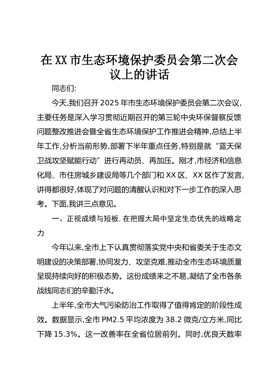 在XX市生態(tài)環(huán)境保護(hù)委員會(huì)第二次會(huì)議上的講話