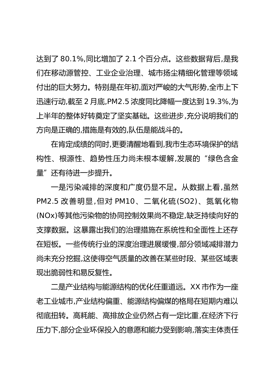 在XX市生態(tài)環(huán)境保護(hù)委員會(huì)第二次會(huì)議上的講話同志們:今天,我們召開2025年市生態(tài)環(huán)境保護(hù)委員會(huì)第二次會(huì)議,主要任務(wù)是深入學(xué)習(xí)貫徹近期召開的第三輪中央環(huán)保督察反饋問題整改推進(jìn)會(huì)暨全省生態(tài)環(huán)境保護(hù)工作推進(jìn)會(huì)精神,總結(jié)上半年工作,分析當(dāng)前形勢(shì),部署下半年重點(diǎn)任務(wù),特別是就“藍(lán)天保衛(wèi)戰(zhàn)攻堅(jiān)賦能行動(dòng)”進(jìn)行再動(dòng)員、再加壓。剛才,市經(jīng)濟(jì)和信息化局、市住房城鄉(xiāng)建設(shè)局等幾個(gè)部門和XX區(qū)、XX區(qū)作了發(fā)言,講得都很好,體現(xiàn)了對(duì)問題的清醒認(rèn)識(shí)和對(duì)下一步工作的深入思考。下面,我講三點(diǎn)意見。一、正視成績(jī)與短板,在把握大局中堅(jiān)定生態(tài)優(yōu)先的戰(zhàn)略定力今年以來,全市上下認(rèn)真貫徹落...