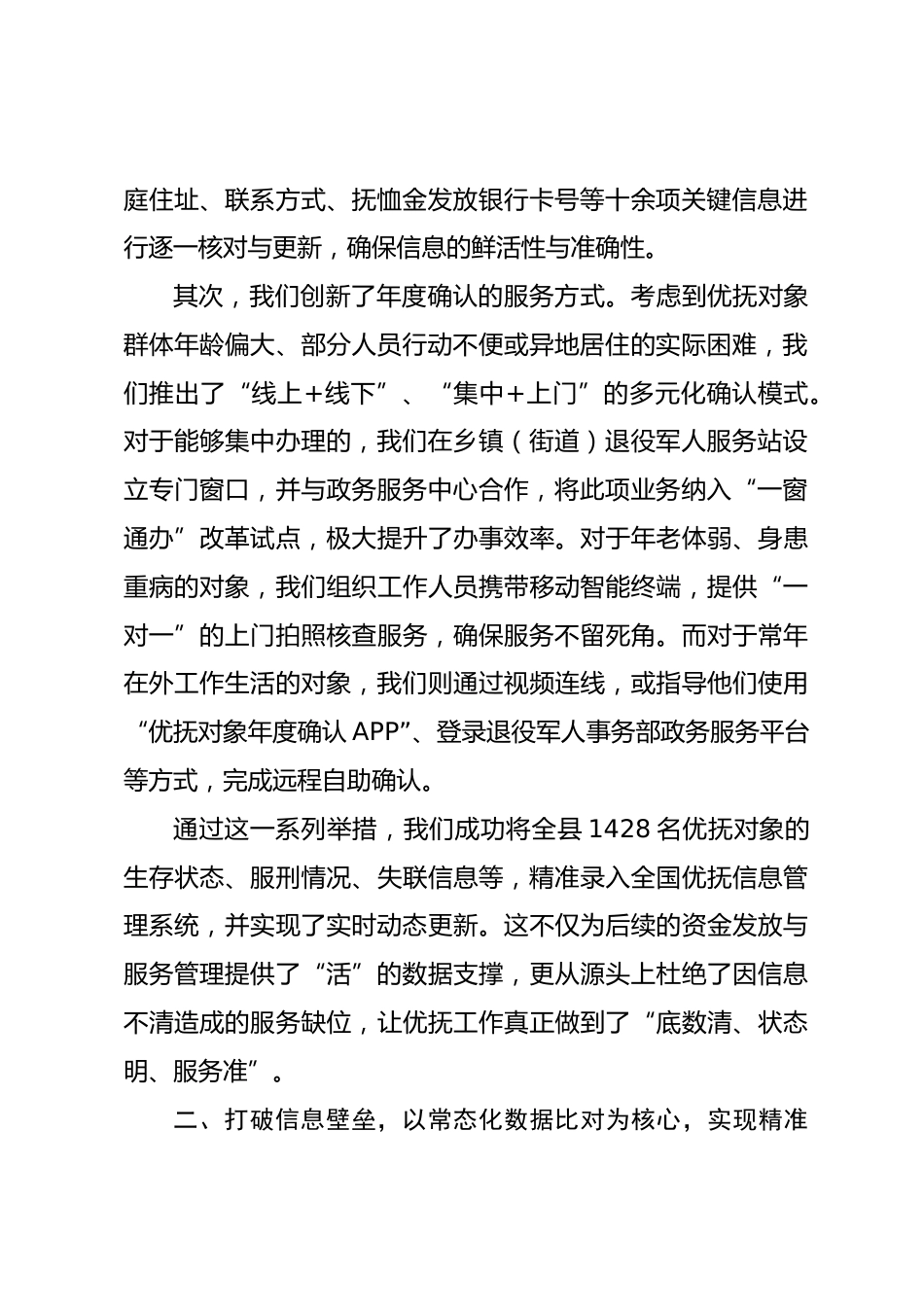 在XX市退役軍人事務(wù)工作會議上的經(jīng)驗匯報尊敬的各位領(lǐng)導(dǎo)、同志們:大家上午好!非常榮幸能在此次會議上,代表XX縣就我縣近年來在優(yōu)撫工作提質(zhì)增效方面的探索與實踐,向各位領(lǐng)導(dǎo)和同仁作簡要匯報。面對新時代退役軍人服務(wù)保障工作的新要求,我們始終堅持以服務(wù)對象為中心,聚焦精準(zhǔn)化、規(guī)范化管理,著力構(gòu)建“四位一體”工作新格局。下面,我將從四個方面展開匯報。一、夯實數(shù)據(jù)根基,以動態(tài)化年度確認(rèn)為抓手,實現(xiàn)精準(zhǔn)識別優(yōu)撫工作的精準(zhǔn)度,源于對服務(wù)對象底數(shù)的精確掌握。我們深刻認(rèn)識到,靜態(tài)、陳舊的數(shù)據(jù)是工作低效乃至出錯的根源。為此,我們徹底改變了以往“一次采...
