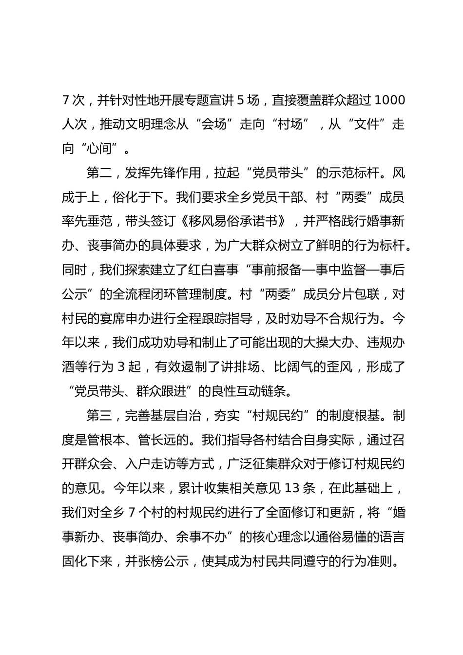 在XX市鄉(xiāng)風(fēng)文明建設(shè)工作推進(jìn)會(huì)上的匯報(bào)尊敬的各位領(lǐng)導(dǎo),同志們:大家上午好!非常榮幸能夠參加本次全市鄉(xiāng)風(fēng)文明建設(shè)工作推進(jìn)會(huì),并代表XX鄉(xiāng)在此作經(jīng)驗(yàn)交流。近年來,我鄉(xiāng)始終將精神文明建設(shè),特別是移風(fēng)易俗工作,作為撬動(dòng)鄉(xiāng)村全面振興的有力杠桿,堅(jiān)持系統(tǒng)謀劃、標(biāo)本兼治,著力在革除陳規(guī)陋習(xí)、培育文明新風(fēng)上探索實(shí)踐,為鄉(xiāng)村發(fā)展注入了強(qiáng)勁的文明動(dòng)能。下面,我將我鄉(xiāng)的主要做法和體會(huì)匯報(bào)如下。一、堅(jiān)持黨建引領(lǐng),筑牢精神文明的“壓艙石”我們深刻認(rèn)識(shí)到,鄉(xiāng)風(fēng)文明建設(shè)是一場(chǎng)深刻的社會(huì)變革,必須依靠堅(jiān)強(qiáng)有力的組織領(lǐng)導(dǎo)。為此,我們始終把黨的建設(shè)擺在首位,以高質(zhì)...