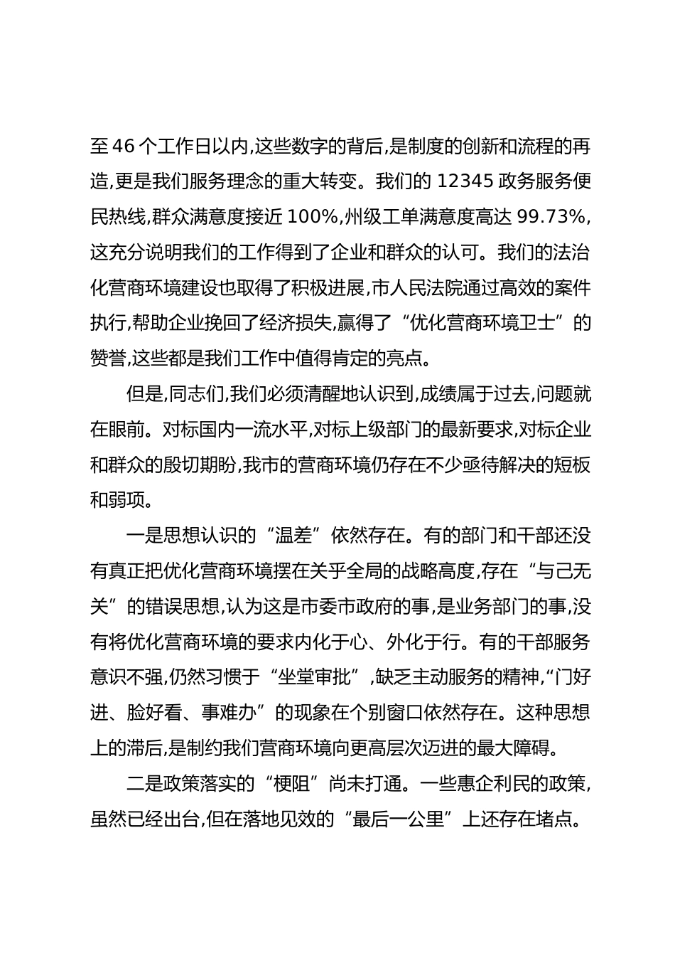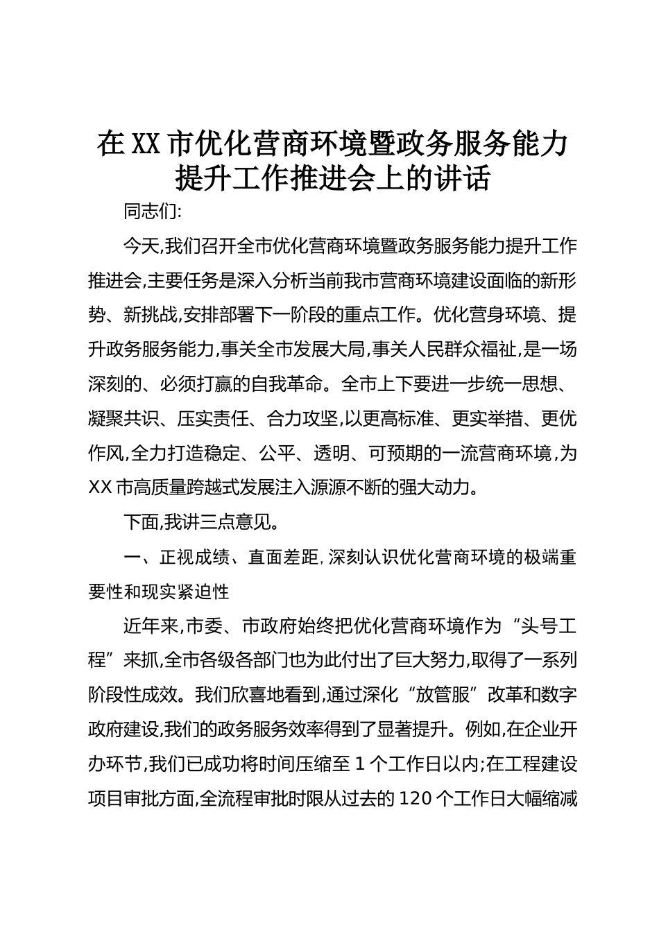在XX市優(yōu)化營商環(huán)境暨政務(wù)服務(wù)能力提升工作推進會上的講話同志們:今天,我們召開全市優(yōu)化營商環(huán)境暨政務(wù)服務(wù)能力提升工作推進會,主要任務(wù)是深入分析當(dāng)前我市營商環(huán)境建設(shè)面臨的新形勢、新挑戰(zhàn),安排部署下一階段的重點工作。優(yōu)化營身環(huán)境、提升政務(wù)服務(wù)能力,事關(guān)全市發(fā)展大局,事關(guān)人民群眾福祉,是一場深刻的、必須打贏的自我革命。全市上下要進一步統(tǒng)一思想、凝聚共識、壓實責(zé)任、合力攻堅,以更高標準、更實舉措、更優(yōu)作風(fēng),全力打造穩(wěn)定、公平、透明、可預(yù)期的一流營商環(huán)境,為XX市高質(zhì)量跨越式發(fā)展注入源源不斷的強大動力。下面,我講三點意見。一、正視成績、直面差距,深刻...