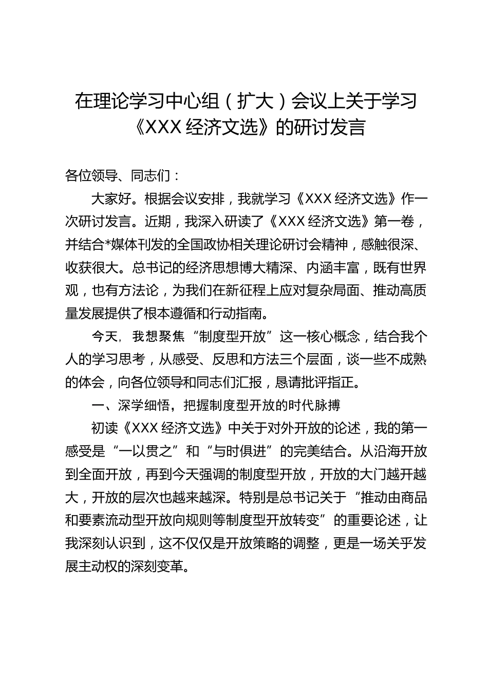 在理論學習中心組(擴大)會議上關于學習《XXX經濟文選》的研討發(fā)言各位領導、同志們:大家好。根據會議安排,我就學習《XXX經濟文選》作一次研討發(fā)言。近期,我深入研讀了《XXX經濟文選》第一卷,并結合*媒體刊發(fā)的全國政協(xié)相關理論研討會精神,感觸很深、收獲很大??倳浀慕洕枷氩┐缶?、內涵豐富,既有世界觀,也有方法論,為我們在新征程上應對復雜局面、推動高質量發(fā)展提供了根本遵循和行動指南。今天,我想聚焦“制度型開放”這一核心概念,結合我個人的學習思考,從感受、反思和方法三個層面,談一些不成熟的體會,向各位領導和同志們匯報,懇請批評指正。一...
