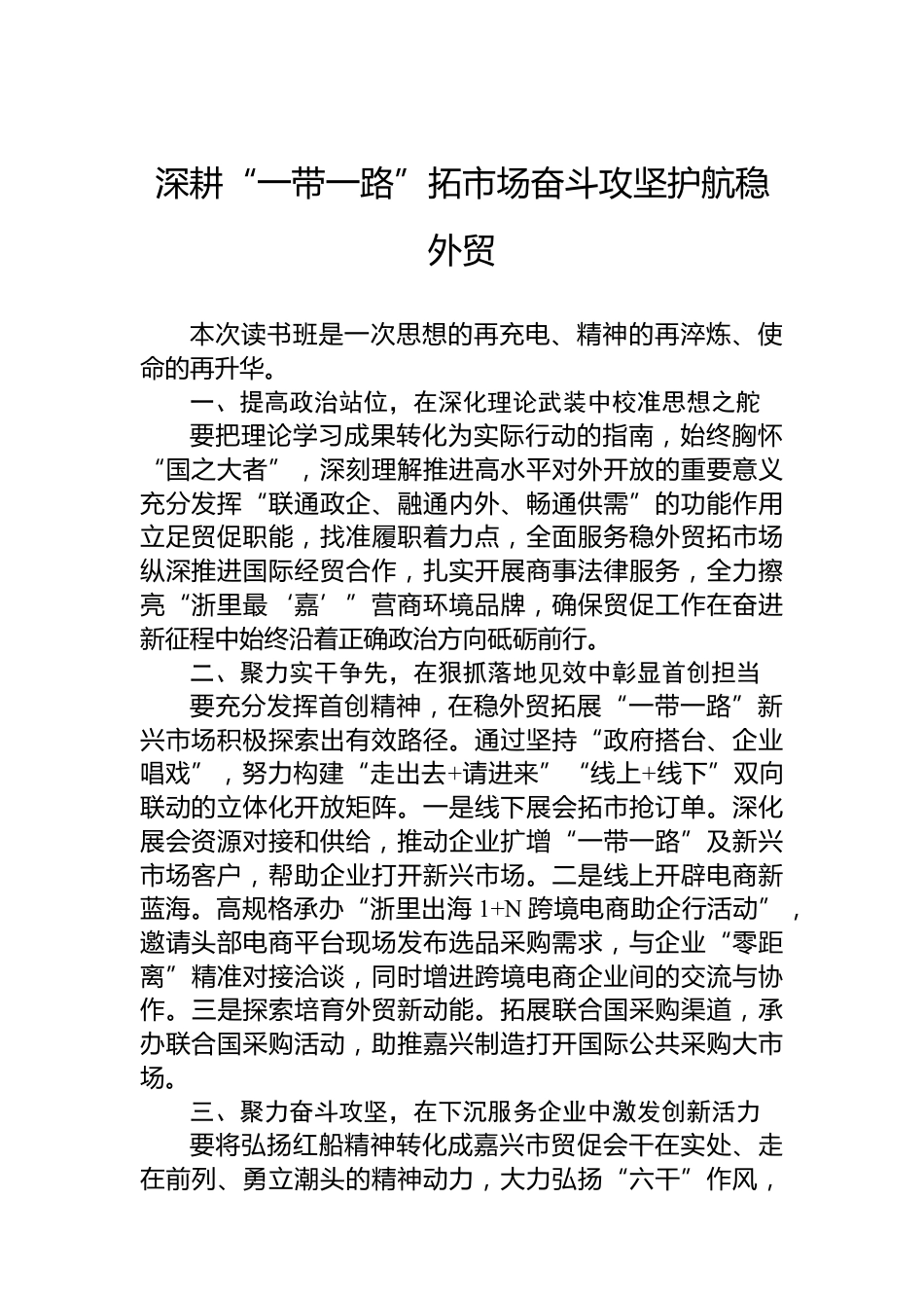 在貿(mào)促系統(tǒng)集中讀書(shū)班上的交流發(fā)言材料匯編(5篇)目錄1.深耕“一帶一路”拓市場(chǎng)奮斗攻堅(jiān)護(hù)航穩(wěn)外貿(mào)....................22.感悟精神之源譜寫(xiě)貿(mào)促新篇..................................................43.傳承紅船精神汲取奮進(jìn)力量..................................................64.青春何為青春能為青春有為..................................................85.不忘初心做一名勤廉奉獻(xiàn)的貿(mào)促人....................................10深耕“一帶一路”拓市場(chǎng)奮斗攻堅(jiān)護(hù)航穩(wěn)外貿(mào)本次讀書(shū)班是一次思想的再充電、精神的再淬煉、使命的再升華。一、提高政治站位...