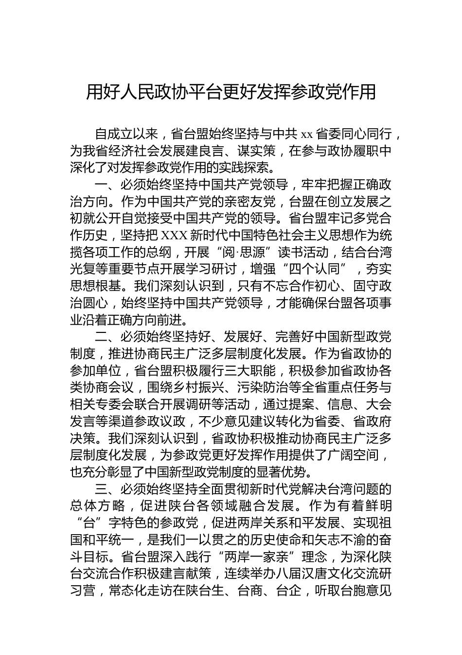 在慶祝政協(xié)成立xx周年理論研討會上的發(fā)言材料匯編(5篇)目錄1.用好人民政協(xié)平臺更好發(fā)揮參政黨作用................................22.新時代人民政協(xié)為人民的xx實(shí)踐.........................................63.傳承中華優(yōu)秀傳統(tǒng)文化譜寫政協(xié)事業(yè)發(fā)展新篇..................84.把握性質(zhì)定位用好實(shí)踐經(jīng)驗(yàn)不斷增強(qiáng)協(xié)商式監(jiān)督實(shí)效....105.站穩(wěn)人民立場做心中有群眾的政協(xié)委員............................12用好人民政協(xié)平臺更好發(fā)揮參政黨作用自成立以來,省臺盟始終堅(jiān)持與中共xx省委同心同行,為我省經(jīng)濟(jì)社會發(fā)展建良言、謀實(shí)策,在參與政協(xié)履職中深化了對發(fā)揮參政黨...