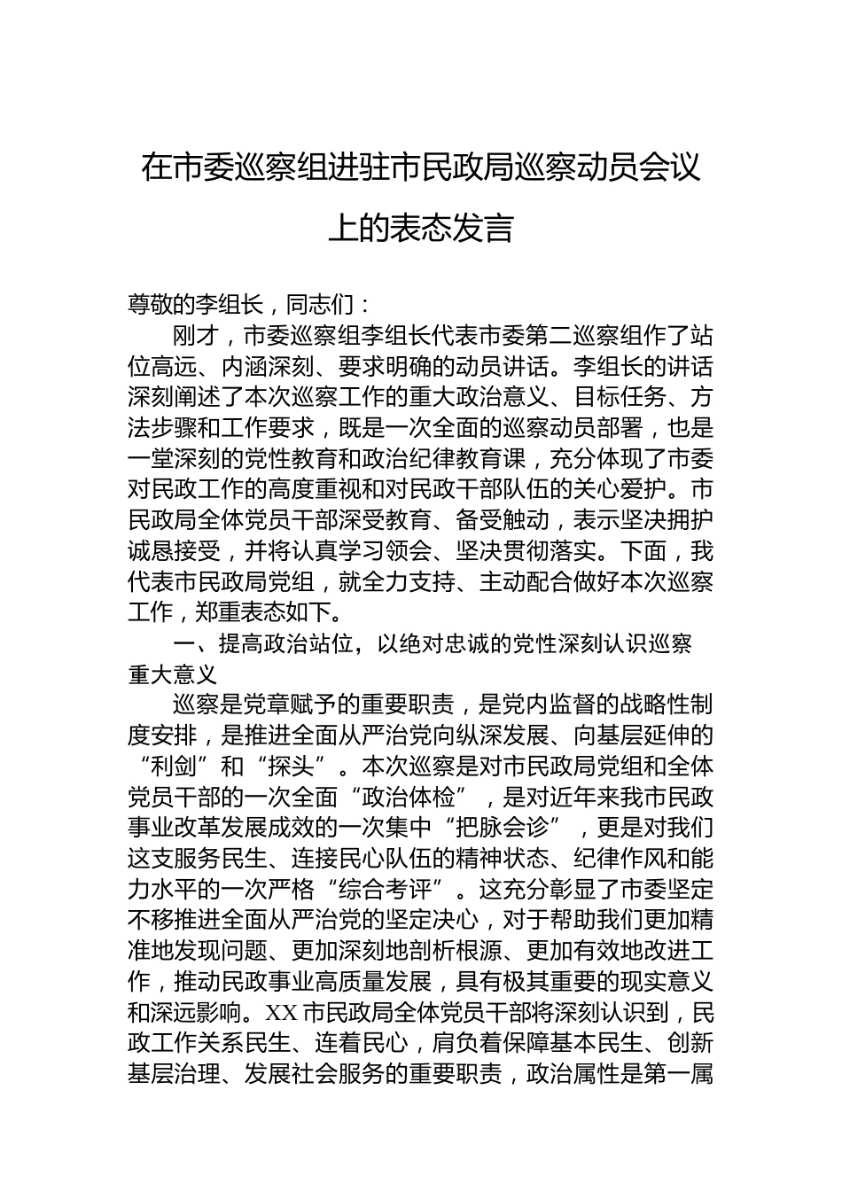 在市委巡察組進(jìn)駐市民政局巡察動(dòng)員會(huì)議上的表態(tài)發(fā)言尊敬的李組長(zhǎng),同志們:剛才,市委巡察組李組長(zhǎng)代表市委第二巡察組作了站位高遠(yuǎn)、內(nèi)涵深刻、要求明確的動(dòng)員講話。李組長(zhǎng)的講話深刻闡述了本次巡察工作的重大政治意義、目標(biāo)任務(wù)、方法步驟和工作要求,既是一次全面的巡察動(dòng)員部署,也是一堂深刻的黨性教育和政治紀(jì)律教育課,充分體現(xiàn)了市委對(duì)民政工作的高度重視和對(duì)民政干部隊(duì)伍的關(guān)心愛(ài)護(hù)。市民政局全體黨員干部深受教育、備受觸動(dòng),表示堅(jiān)決擁護(hù)誠(chéng)懇接受,并將認(rèn)真學(xué)習(xí)領(lǐng)會(huì)、堅(jiān)決貫徹落實(shí)。下面,我代表市民政局黨組,就全力支持、主動(dòng)配合做好本次巡察工作,鄭重表態(tài)...