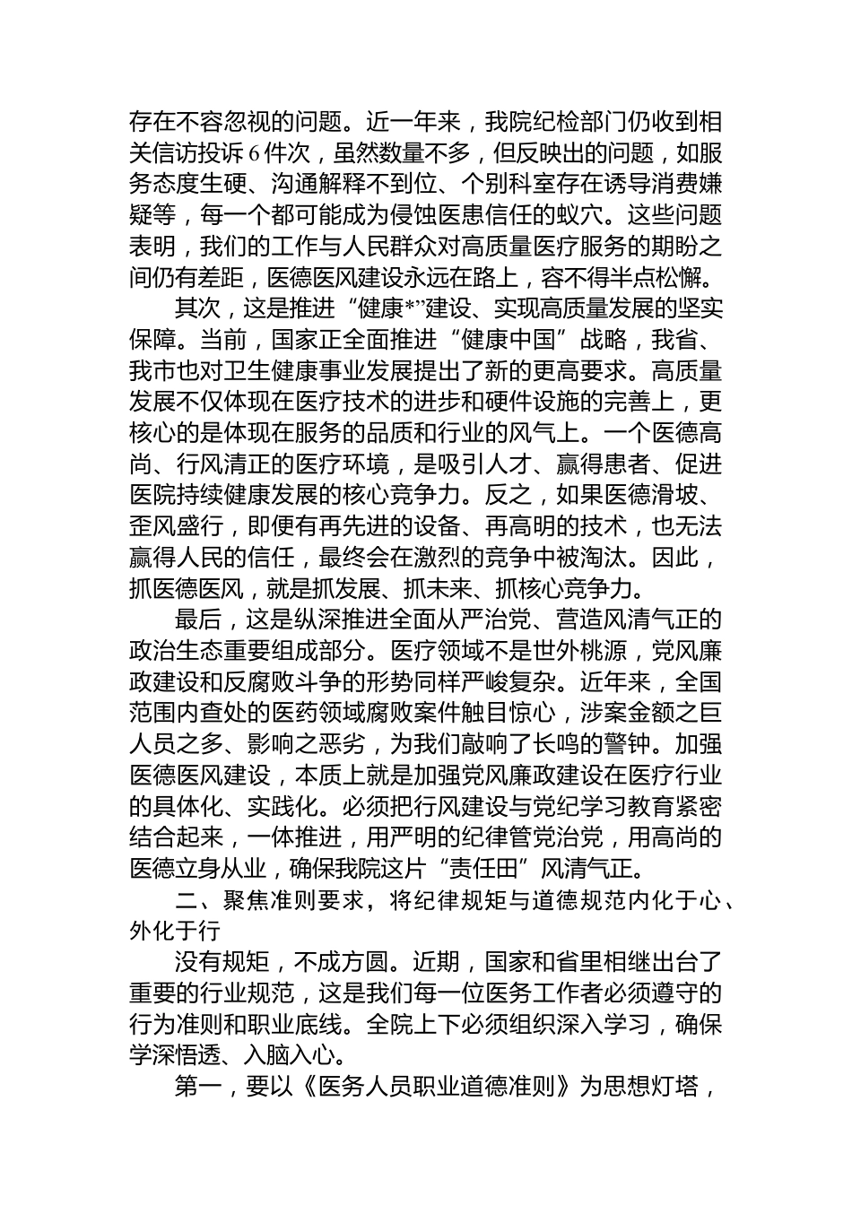在衛(wèi)生院黨紀(jì)專題暨醫(yī)德醫(yī)風(fēng)專項(xiàng)提升行動(dòng)動(dòng)員部署會(huì)上的講話同志們:今天,我們在這里召開全院黨紀(jì)學(xué)習(xí)教育暨醫(yī)德醫(yī)風(fēng)專項(xiàng)提升行動(dòng)動(dòng)員部署會(huì),主要任務(wù)是深入學(xué)習(xí)貫徹關(guān)于全面從嚴(yán)治黨和加強(qiáng)醫(yī)德醫(yī)風(fēng)建設(shè)的重要指示精神,認(rèn)真落實(shí)上級黨委和衛(wèi)生健康主管部門的工作部署,對我院當(dāng)前和今后一個(gè)時(shí)期的黨風(fēng)廉政與醫(yī)德醫(yī)風(fēng)建設(shè)工作進(jìn)行全面動(dòng)員和系統(tǒng)安排。這次會(huì)議既是一次思想統(tǒng)一會(huì),也是一次工作部署會(huì),更是一次警示教育會(huì)。下面,我講幾點(diǎn)意見。一、提高政治站位,深刻認(rèn)識新時(shí)代加強(qiáng)醫(yī)德醫(yī)風(fēng)建設(shè)的極端重要性黨的領(lǐng)導(dǎo)和黨的建設(shè)是衛(wèi)生健康事業(yè)發(fā)展的“根”和“魂”。...