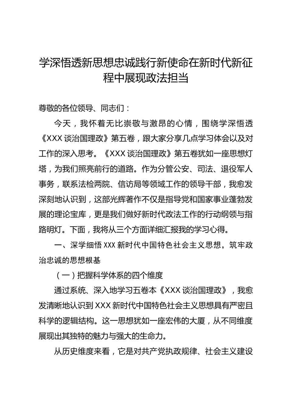 學深悟透新思想忠誠踐行新使命在新時代新征程中展現(xiàn)政法擔當尊敬的各位領導、同志們:今天,我懷著無比崇敬與激昂的心情,圍繞學深悟透《XXX談治國理政》第五卷,跟大家分享幾點學習體會以及對工作的深入思考?!禭XX談治國理政》第五卷猶如一座思想燈塔,為我們照亮前行的道路。作為分管公安、司法、退役軍人事務,聯(lián)系法檢兩院、信訪局等領域工作的領導干部,我愈發(fā)深刻地認識到,這部光輝著作不僅是指導黨和國家事業(yè)蓬勃發(fā)展的理論寶庫,更是我們做好新時代政法工作的行動綱領與指路明燈。下面,我將從三個方面詳細匯報我的學習心得。一、深學細悟XXX新時代中國特色社...