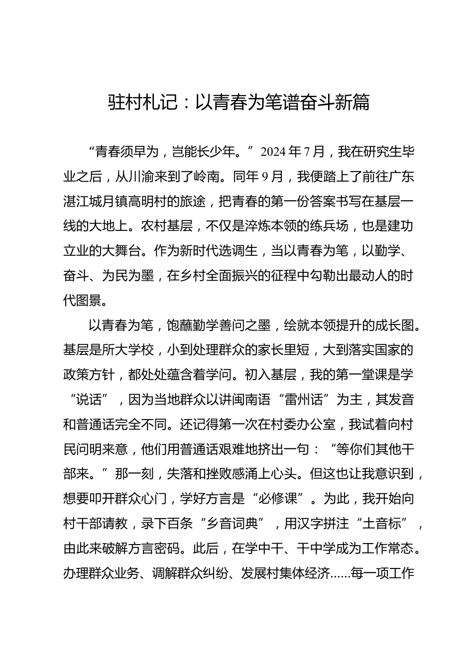駐村札記:以青春為筆譜奮斗新篇“青春須早為,豈能長少年。”2024年7月,我在研究生畢業(yè)之后,從川渝來到了嶺南。同年9月,我便踏上了前往廣東湛江城月鎮(zhèn)高明村的旅途,把青春的第一份答案書寫在基層一線的大地上。農(nóng)村基層,不僅是淬煉本領(lǐng)的練兵場,也是建功立業(yè)的大舞臺(tái)。作為新時(shí)代選調(diào)生,當(dāng)以青春為筆,以勤學(xué)、奮斗、為民為墨,在鄉(xiāng)村全面振興的征程中勾勒出最動(dòng)人的時(shí)代圖景。以青春為筆,飽蘸勤學(xué)善問之墨,繪就本領(lǐng)提升的成長圖?;鶎邮撬髮W(xué)校,小到處理群眾的家長里短,大到落實(shí)國家的政策方針,都處處蘊(yùn)含著學(xué)問。初入基層,我的第一堂課是學(xué)“說話”,因...