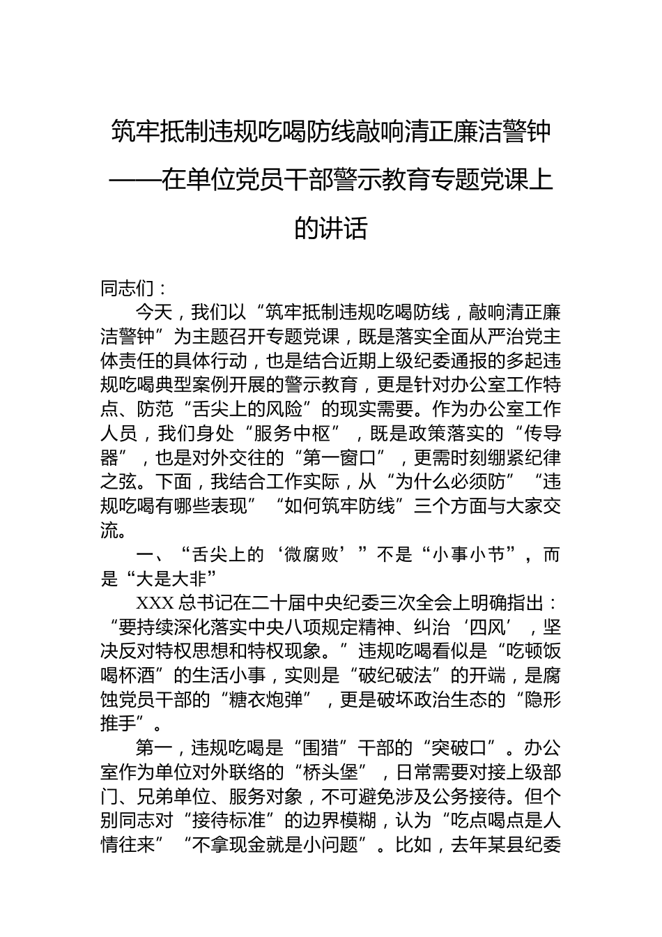 筑牢抵制違規(guī)吃喝防線敲響清正廉潔警鐘——在單位黨員干部警示教育專題黨課上的講話同志們:今天,我們以“筑牢抵制違規(guī)吃喝防線,敲響清正廉潔警鐘”為主題召開專題黨課,既是落實(shí)全面從嚴(yán)治黨主體責(zé)任的具體行動(dòng),也是結(jié)合近期上級(jí)紀(jì)委通報(bào)的多起違規(guī)吃喝典型案例開展的警示教育,更是針對(duì)辦公室工作特點(diǎn)、防范“舌尖上的風(fēng)險(xiǎn)”的現(xiàn)實(shí)需要。作為辦公室工作人員,我們身處“服務(wù)中樞”,既是政策落實(shí)的“傳導(dǎo)器”,也是對(duì)外交往的“第一窗口”,更需時(shí)刻繃緊紀(jì)律之弦。下面,我結(jié)合工作實(shí)際,從“為什么必須防”“違規(guī)吃喝有哪些表現(xiàn)”“如何筑牢防線”三個(gè)方面與大家交...