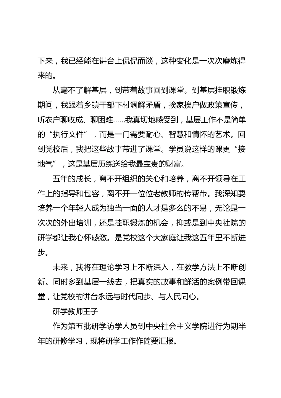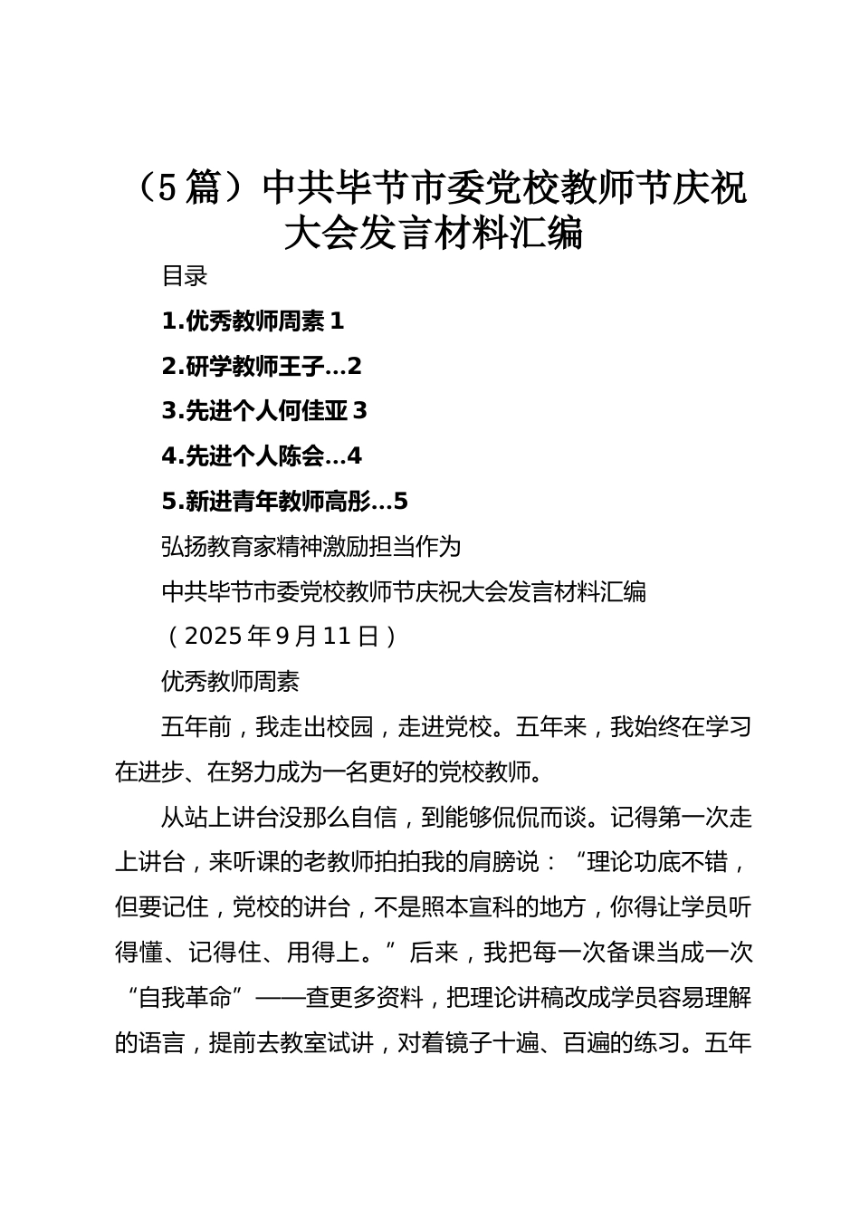 (5篇)中共畢節(jié)市委黨校教師節(jié)慶祝大會發(fā)言材料匯編目錄1.優(yōu)秀教師周素12.研學(xué)教師王子…23.先進個人何佳亞34.先進個人陳會…45.新進青年教師高彤…5弘揚教育家精神激勵擔(dān)當(dāng)作為中共畢節(jié)市委黨校教師節(jié)慶祝大會發(fā)言材料匯編(2025年9月11日)優(yōu)秀教師周素五年前,我走出校園,走進黨校。五年來,我始終在學(xué)習(xí)在進步、在努力成為一名更好的黨校教師。從站上講臺沒那么自信,到能夠侃侃而談。記得第一次走上講臺,來聽課的老教師拍拍我的肩膀說:“理論功底不錯,但要記住,黨校的講臺,不是照本宣科的地方,你得讓學(xué)員聽得懂、記得住、用得上?!焙髞?,我把每一次備課當(dāng)...
