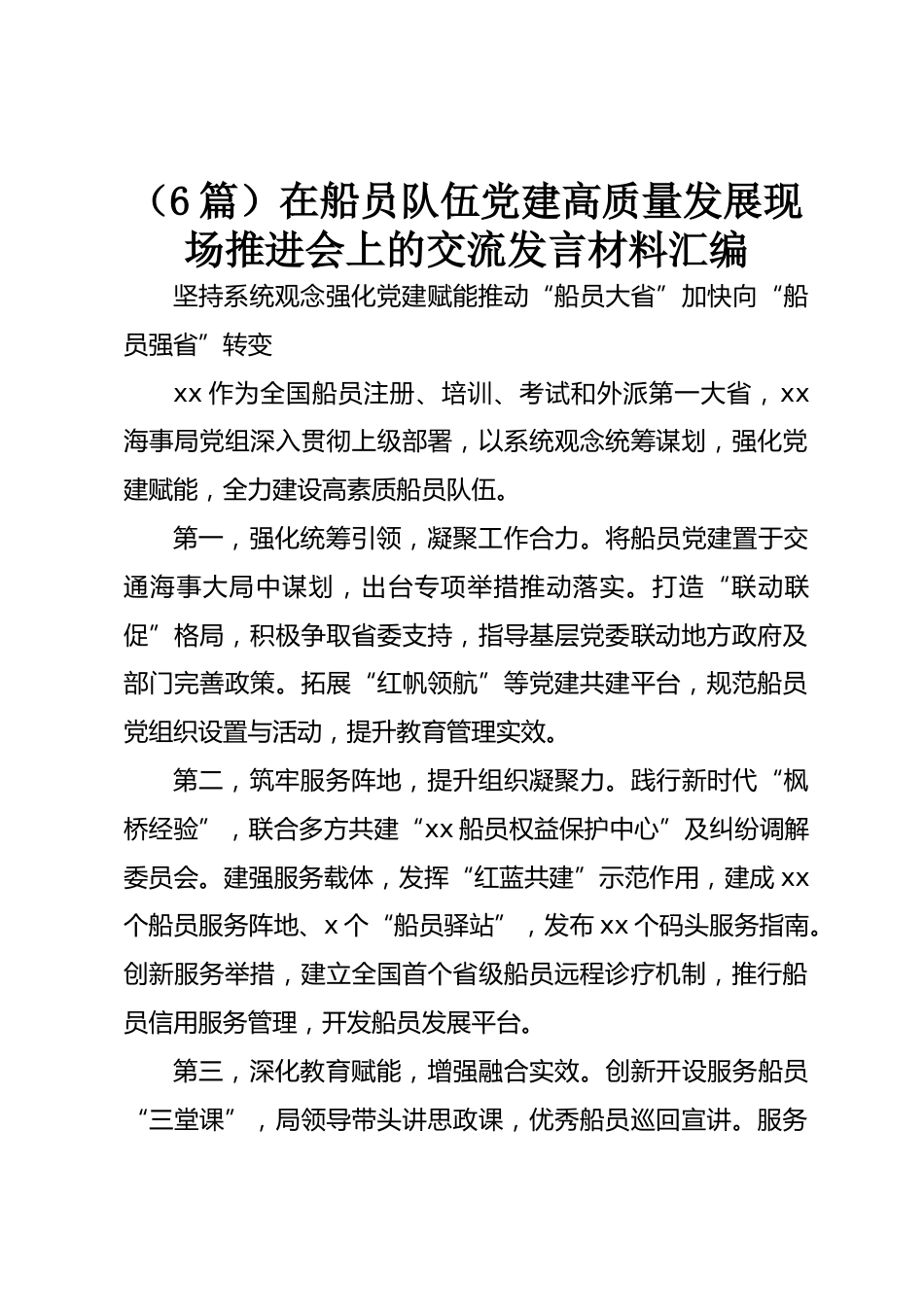 (6篇)在船員隊(duì)伍黨建高質(zhì)量發(fā)展現(xiàn)場(chǎng)推進(jìn)會(huì)上的交流發(fā)言材料匯編