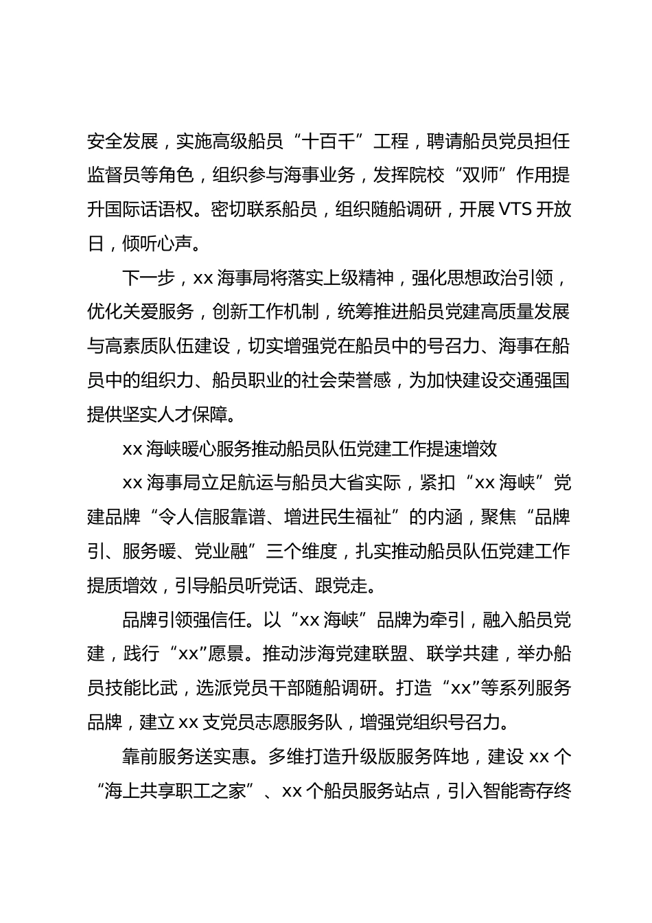 (6篇)在船員隊(duì)伍黨建高質(zhì)量發(fā)展現(xiàn)場(chǎng)推進(jìn)會(huì)上的交流發(fā)言材料匯編堅(jiān)持系統(tǒng)觀念強(qiáng)化黨建賦能推動(dòng)“船員大省”加快向“船員強(qiáng)省”轉(zhuǎn)變xx作為全國船員注冊(cè)、培訓(xùn)、考試和外派第一大省,xx海事局黨組深入貫徹上級(jí)部署,以系統(tǒng)觀念統(tǒng)籌謀劃,強(qiáng)化黨建賦能,全力建設(shè)高素質(zhì)船員隊(duì)伍。第一,強(qiáng)化統(tǒng)籌引領(lǐng),凝聚工作合力。將船員黨建置于交通海事大局中謀劃,出臺(tái)專項(xiàng)舉措推動(dòng)落實(shí)。打造“聯(lián)動(dòng)聯(lián)促”格局,積極爭(zhēng)取省委支持,指導(dǎo)基層黨委聯(lián)動(dòng)地方政府及部門完善政策。拓展“紅帆領(lǐng)航”等黨建共建平臺(tái),規(guī)范船員黨組織設(shè)置與活動(dòng),提升教育管理實(shí)效。第二,筑牢服務(wù)陣地,提升組...