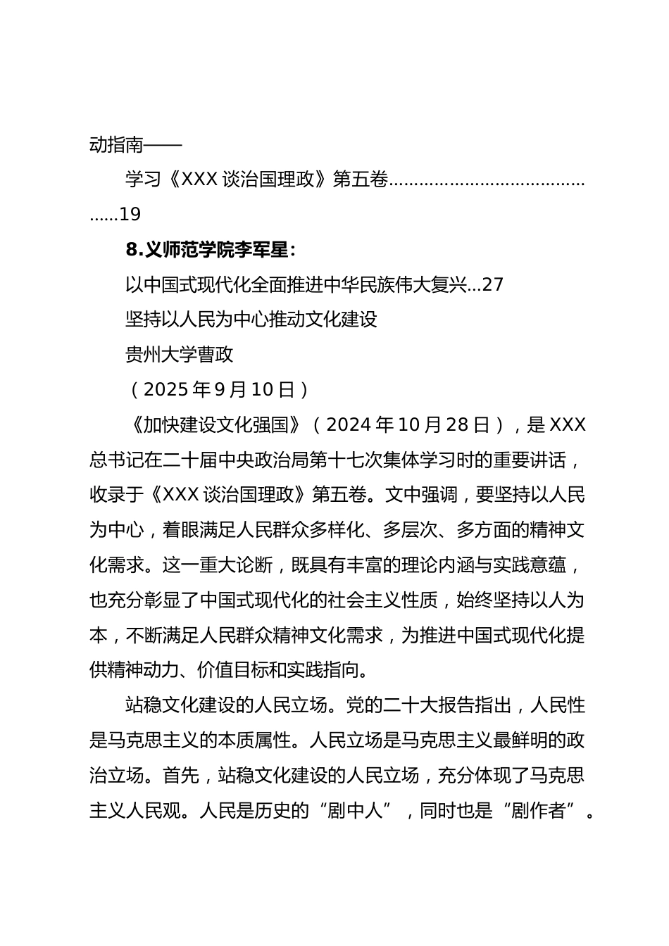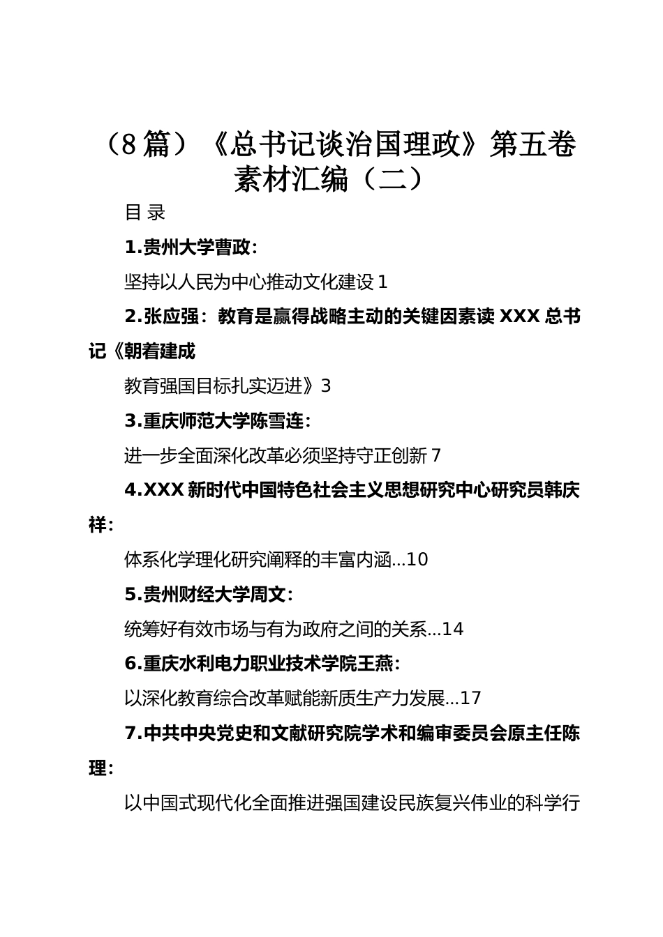 (8篇)《總書記談治國理政》第五卷素材匯編(二)目錄1.貴州大學(xué)曹政:堅(jiān)持以人民為中心推動(dòng)文化建設(shè)12.張應(yīng)強(qiáng):教育是贏得戰(zhàn)略主動(dòng)的關(guān)鍵因素讀XXX總書記《朝著建成教育強(qiáng)國目標(biāo)扎實(shí)邁進(jìn)》33.重慶師范大學(xué)陳雪連:進(jìn)一步全面深化改革必須堅(jiān)持守正創(chuàng)新74.XXX新時(shí)代中國特色社會(huì)主義思想研究中心研究員韓慶祥:體系化學(xué)理化研究闡釋的豐富內(nèi)涵…105.貴州財(cái)經(jīng)大學(xué)周文:統(tǒng)籌好有效市場與有為政府之間的關(guān)系…146.重慶水利電力職業(yè)技術(shù)學(xué)院王燕:以深化教育綜合改革賦能新質(zhì)生產(chǎn)力發(fā)展…177.中共中央黨史和文獻(xiàn)研究院學(xué)術(shù)和編審委員會(huì)原主任陳理:以中國式現(xiàn)代化全面推進(jìn)強(qiáng)...