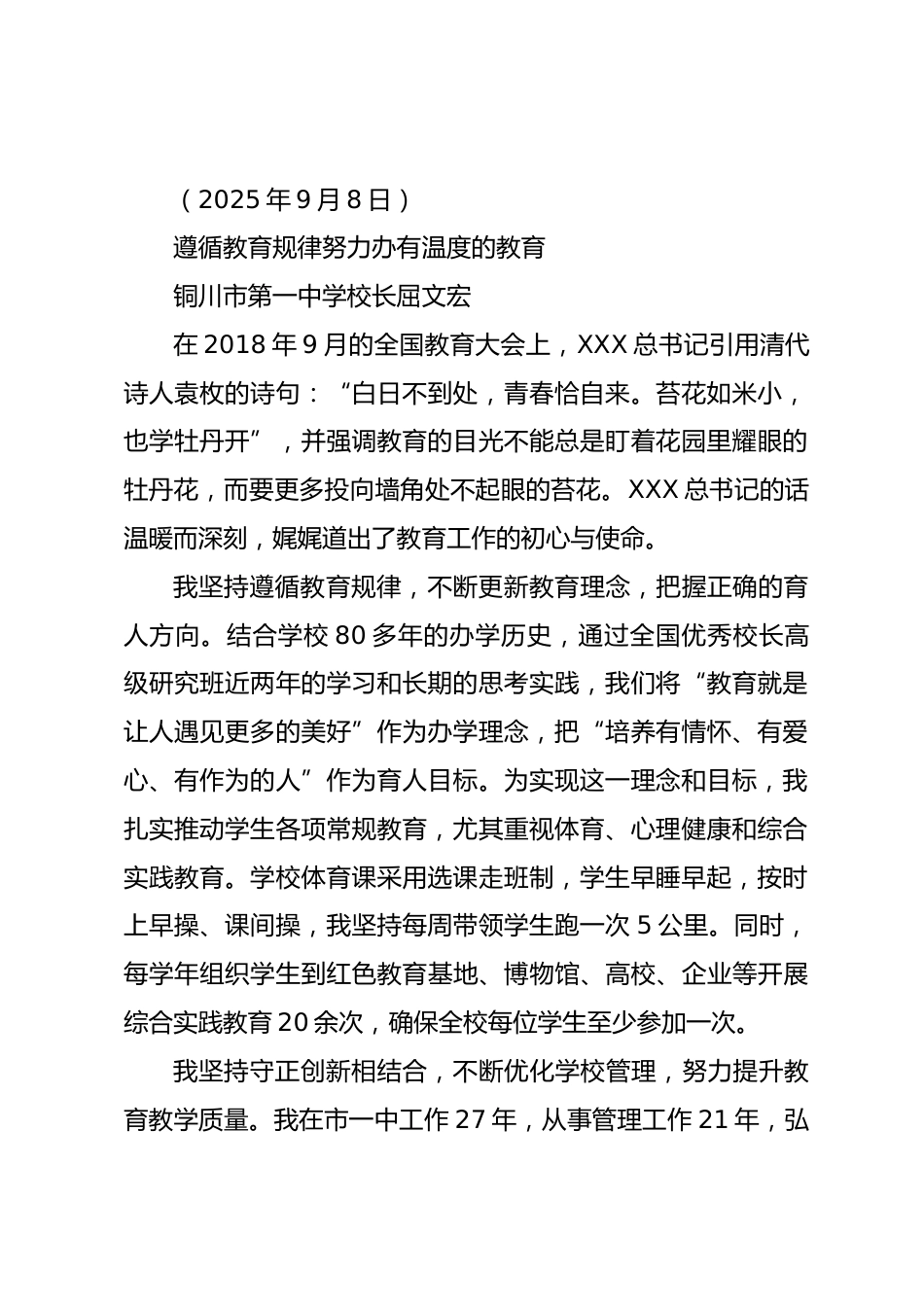 (8篇)銅川市慶祝第41個(gè)教師節(jié)座談會(huì)發(fā)言材料匯編目錄1.銅川市第一中學(xué)校長(zhǎng)屈文宏:遵循教育規(guī)律努力辦有溫度的教育12.銅川陽(yáng)光中學(xué)校長(zhǎng)李保凌:守教育報(bào)國(guó)初心擔(dān)立德樹(shù)人使命…33.銅川職業(yè)技術(shù)學(xué)院教師辛媛:點(diǎn)燃信念之火走出精彩人生…44.銅川市第五中學(xué)教師姚靚靚:螢火雖微愿為其芒…65.中國(guó)工農(nóng)紅軍照金北梁紅軍小學(xué)教師劉洋:以教育之名赴紅色之約…86.宜君縣五里鎮(zhèn)中心小學(xué)教師和艷艷:躬耕鄉(xiāng)村教育點(diǎn)亮希望之光107.銅川市王益區(qū)第一幼兒園教師惠建敏:用愛(ài)守護(hù)童年以專業(yè)照亮幼教之路…128.銅川市特殊教育學(xué)校教師寇潤(rùn)娥:深耕特教沃土靜待向陽(yáng)花開(kāi)13銅川市慶祝...
