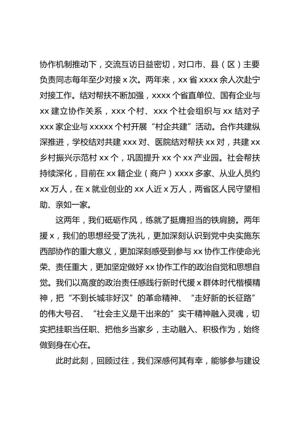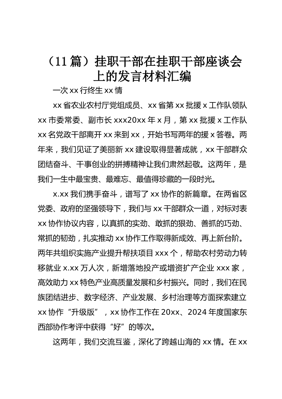 (11篇)掛職干部在掛職干部座談會(huì)上的發(fā)言材料匯編一次xx行終生xx情xx省農(nóng)業(yè)農(nóng)村廳黨組成員、xx省第xx批援x工作隊(duì)領(lǐng)隊(duì)xx市委常委、副市長(zhǎng)xxx20xx年x月,第xx批援x工作隊(duì)xx名黨政干部離開xx來到xx,開始書寫兩年的援x答卷。兩年來,我們見證了美麗新xx建設(shè)取得顯著成就,xx干部群眾團(tuán)結(jié)奮斗、干事創(chuàng)業(yè)的拼搏精神讓我們肅然起敬。這兩年,是我們一生中最寶貴、最難忘、最值得珍藏的一段時(shí)光。x.xx我們攜手奮斗,譜寫了xx協(xié)作的新篇章。在兩省區(qū)黨委、政府的堅(jiān)強(qiáng)領(lǐng)導(dǎo)下,我們與xx干部群眾一道,對(duì)標(biāo)對(duì)表xx協(xié)作協(xié)議內(nèi)容,以真抓的實(shí)勁、敢抓的狠勁、善抓的巧勁、常抓的韌勁...