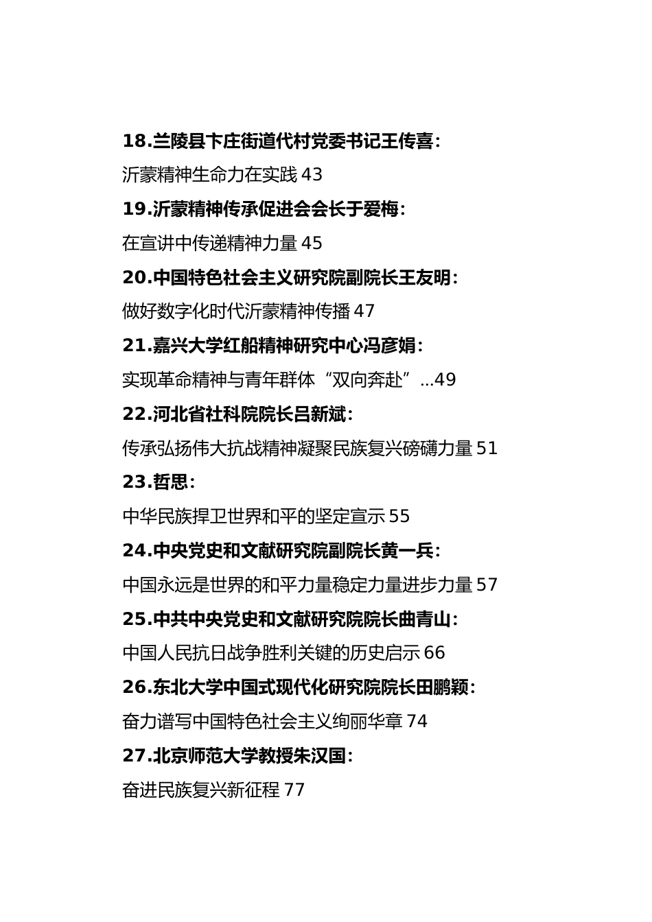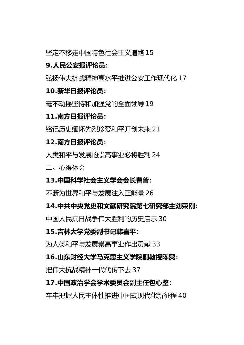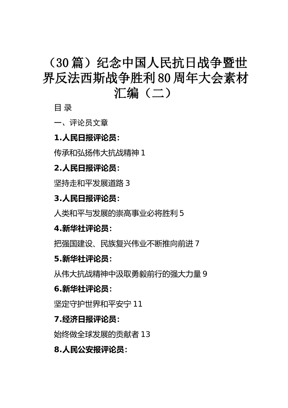 (30篇)紀(jì)念中國(guó)人民抗日戰(zhàn)爭(zhēng)暨世界反法西斯戰(zhàn)爭(zhēng)勝利80周年大會(huì)素材匯編(二)目錄一、評(píng)論員文章1.人民日?qǐng)?bào)評(píng)論員:傳承和弘揚(yáng)偉大抗戰(zhàn)精神12.人民日?qǐng)?bào)評(píng)論員:堅(jiān)持走和平發(fā)展道路33.人民日?qǐng)?bào)評(píng)論員:人類和平與發(fā)展的崇高事業(yè)必將勝利54.新華社評(píng)論員:把強(qiáng)國(guó)建設(shè)、民族復(fù)興偉業(yè)不斷推向前進(jìn)75.新華社評(píng)論員:從偉大抗戰(zhàn)精神中汲取勇毅前行的強(qiáng)大力量96.新華社評(píng)論員:堅(jiān)定守護(hù)世界和平安寧117.經(jīng)濟(jì)日?qǐng)?bào)評(píng)論員:始終做全球發(fā)展的貢獻(xiàn)者138.人民公安報(bào)評(píng)論員:堅(jiān)定不移走中國(guó)特色社會(huì)主義道路159.人民公安報(bào)評(píng)論員:弘揚(yáng)偉大抗戰(zhàn)精神高水平推進(jìn)公安工作現(xiàn)代化1710.新華...