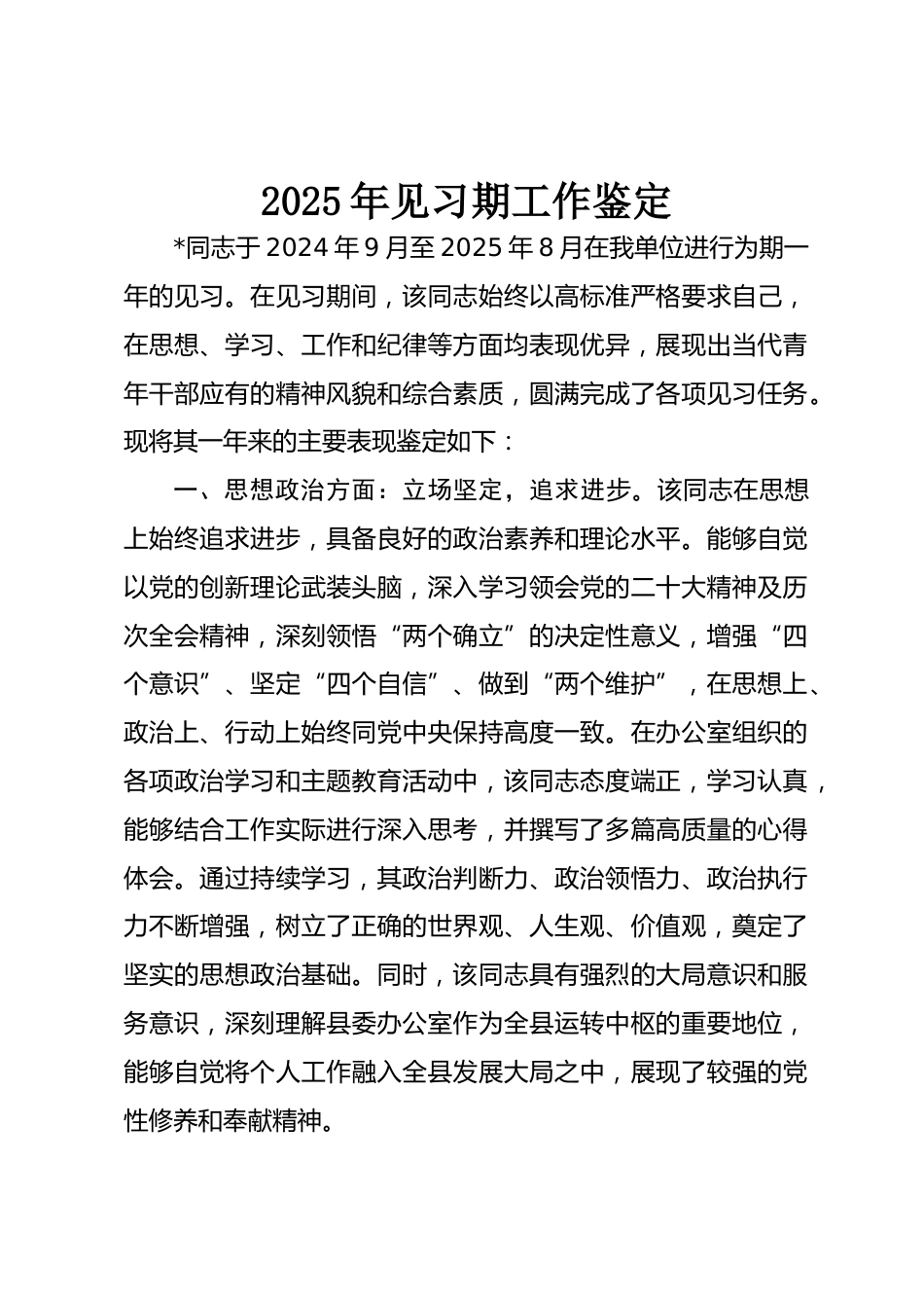 2025年見習(xí)期工作鑒定*同志于2024年9月至2025年8月在我單位進行為期一年的見習(xí)。在見習(xí)期間,該同志始終以高標(biāo)準(zhǔn)嚴(yán)格要求自己,在思想、學(xué)習(xí)、工作和紀(jì)律等方面均表現(xiàn)優(yōu)異,展現(xiàn)出當(dāng)代青年干部應(yīng)有的精神風(fēng)貌和綜合素質(zhì),圓滿完成了各項見習(xí)任務(wù)?,F(xiàn)將其一年來的主要表現(xiàn)鑒定如下:一、思想政治方面:立場堅定,追求進步。該同志在思想上始終追求進步,具備良好的政治素養(yǎng)和理論水平。能夠自覺以黨的創(chuàng)新理論武裝頭腦,深入學(xué)習(xí)領(lǐng)會黨的二十大精神及歷次全會精神,深刻領(lǐng)悟“兩個確立”的決定性意義,增強“四個意識”、堅定“四個自信”、做到“兩個維護”,在思想上、...