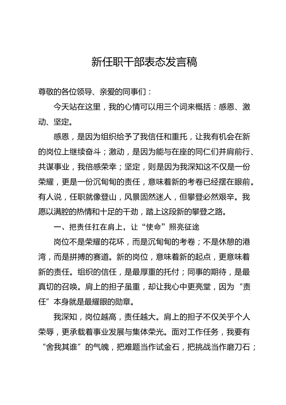 新任職干部表態(tài)發(fā)言稿尊敬的各位領導、親愛的同事們:今天站在這里,我的心情可以用三個詞來概括:感恩、激動、堅定。感恩,是因為組織給予了我信任和重托,讓我有機會在新的崗位上繼續(xù)奮斗;激動,是因為能與在座的同仁們并肩前行、共謀事業(yè),我倍感榮幸;堅定,則是因為我深知這不僅是一份榮耀,更是一份沉甸甸的責任,意味著新的考卷已經擺在眼前。有人說,任職就像登山,風景固然迷人,但攀登必然艱辛。我愿以滿腔的熱情和十足的干勁,踏上這段新的攀登之路。一、把責任扛在肩上,讓“使命”照亮征途崗位不是榮耀的花環(huán),而是沉甸甸的考卷;不是休憩的港灣,而是拼搏...