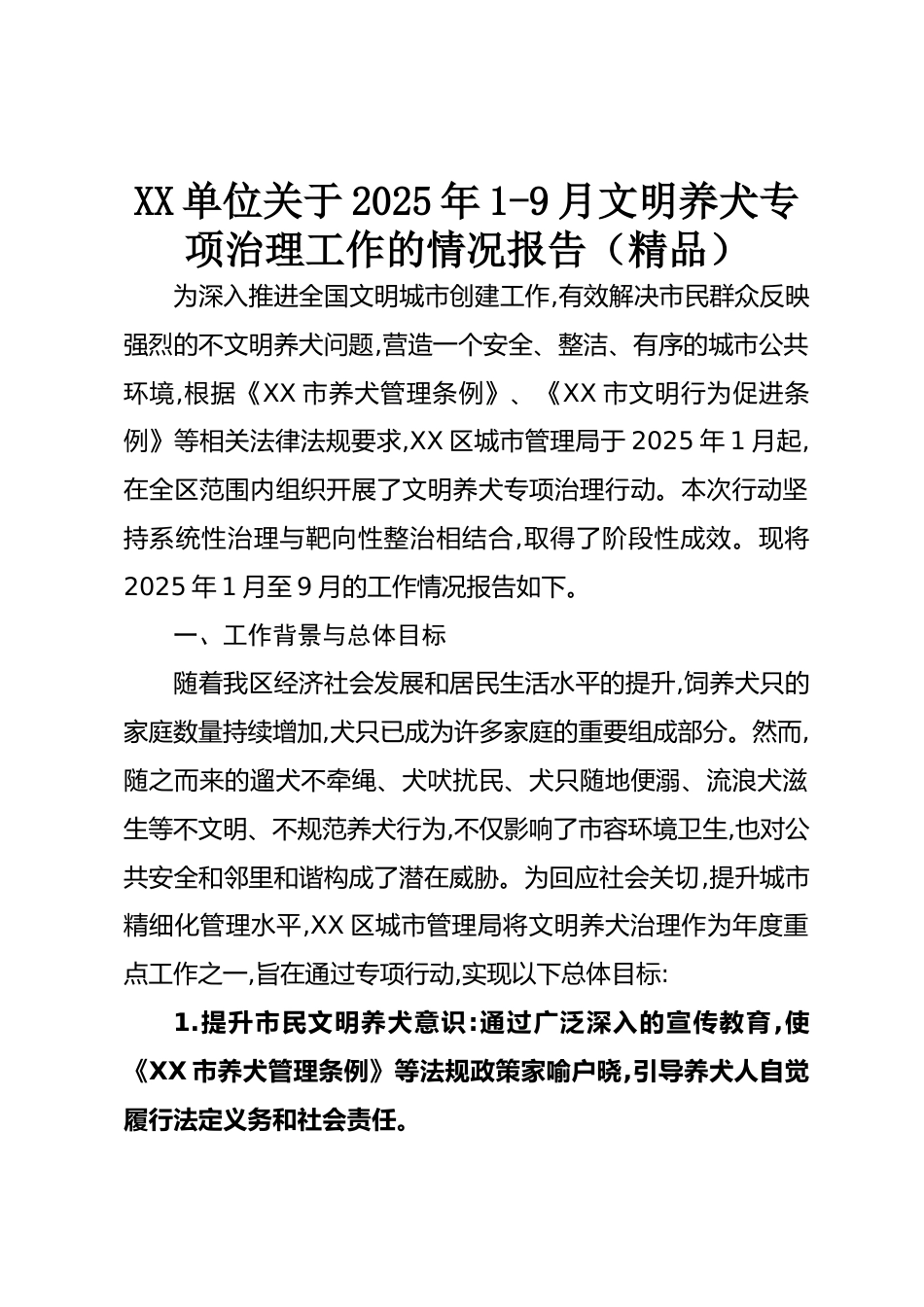 XX單位關(guān)于2025年1-9月文明養(yǎng)犬專項(xiàng)治理工作的情況報(bào)告(精品)