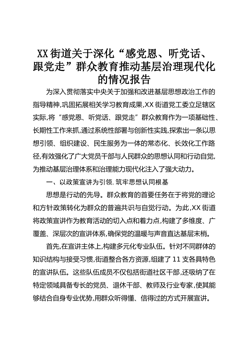 XX街道關(guān)于深化“感黨恩、聽黨話、跟黨走”群眾教育推動(dòng)基層治理現(xiàn)代化的情況報(bào)告