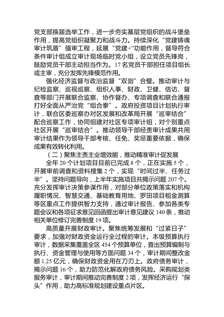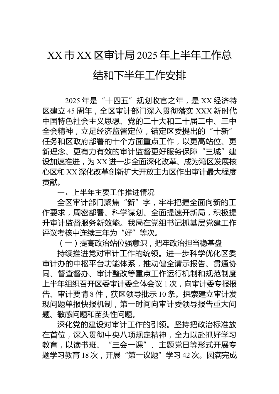 XX市XX區(qū)審計局2025年上半年工作總結(jié)和下半年工作安排2025年是“十四五”規(guī)劃收官之年,是XX經(jīng)濟特區(qū)建立45周年,全區(qū)審計部門深入貫徹落實XXX新時代中國特色社會主義思想、黨的二十大和二十屆二中、三中全會精神,立足經(jīng)濟監(jiān)督定位,錨定區(qū)委提出的“十新”任務(wù)和區(qū)政府部署的十個方面重點工作,以更高站位、更新理念、更有力有效的審計監(jiān)督更好服務(wù)保障“三城”建設(shè)加速推進(jìn),為XX進(jìn)一步全面深化改革、成為灣區(qū)發(fā)展核心區(qū)和XX深化改革創(chuàng)新擴大開放主力區(qū)作出審計最大程度貢獻(xiàn)。一、上半年主要工作推進(jìn)情況全區(qū)審計部門聚焦“新”字,牢牢把握全面向新的工作要求,周密...