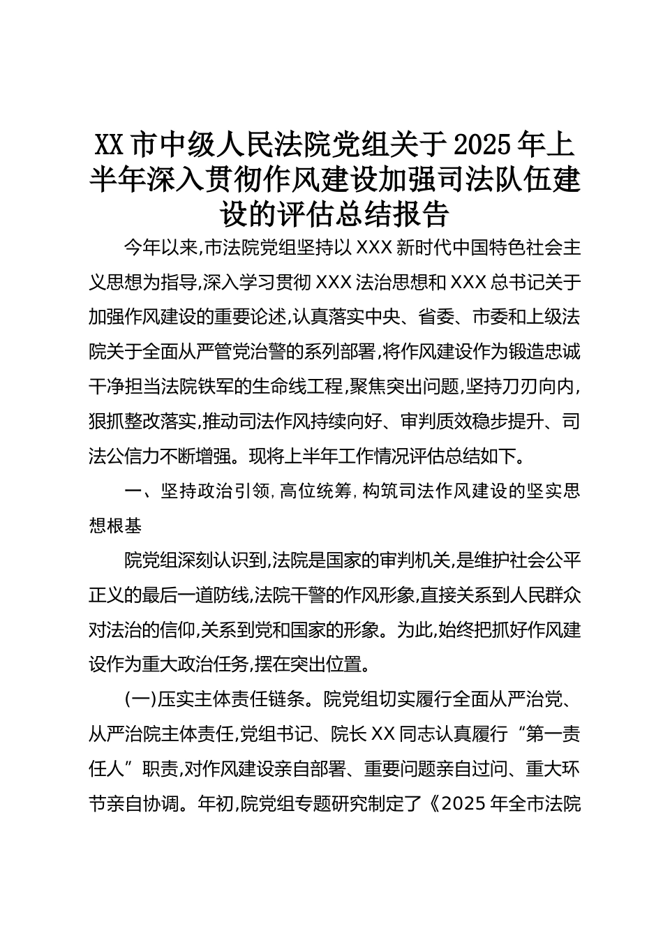 XX市中級人民法院黨組關于2025年上半年深入貫徹作風建設加強司法隊伍建設的評估總結(jié)報告今年以來,市法院黨組堅持以XXX新時代中國特色社會主義思想為指導,深入學習貫徹XXX法治思想和XXX總書記關于加強作風建設的重要論述,認真落實中央、省委、市委和上級法院關于全面從嚴管黨治警的系列部署,將作風建設作為鍛造忠誠干凈擔當法院鐵軍的生命線工程,聚焦突出問題,堅持刀刃向內(nèi),狠抓整改落實,推動司法作風持續(xù)向好、審判質(zhì)效穩(wěn)步提升、司法公信力不斷增強?,F(xiàn)將上半年工作情況評估總結(jié)如下。一、堅持政治引領,高位統(tǒng)籌,構(gòu)筑司法作風建設的堅實思想根基院黨組深刻認識到,法院是...