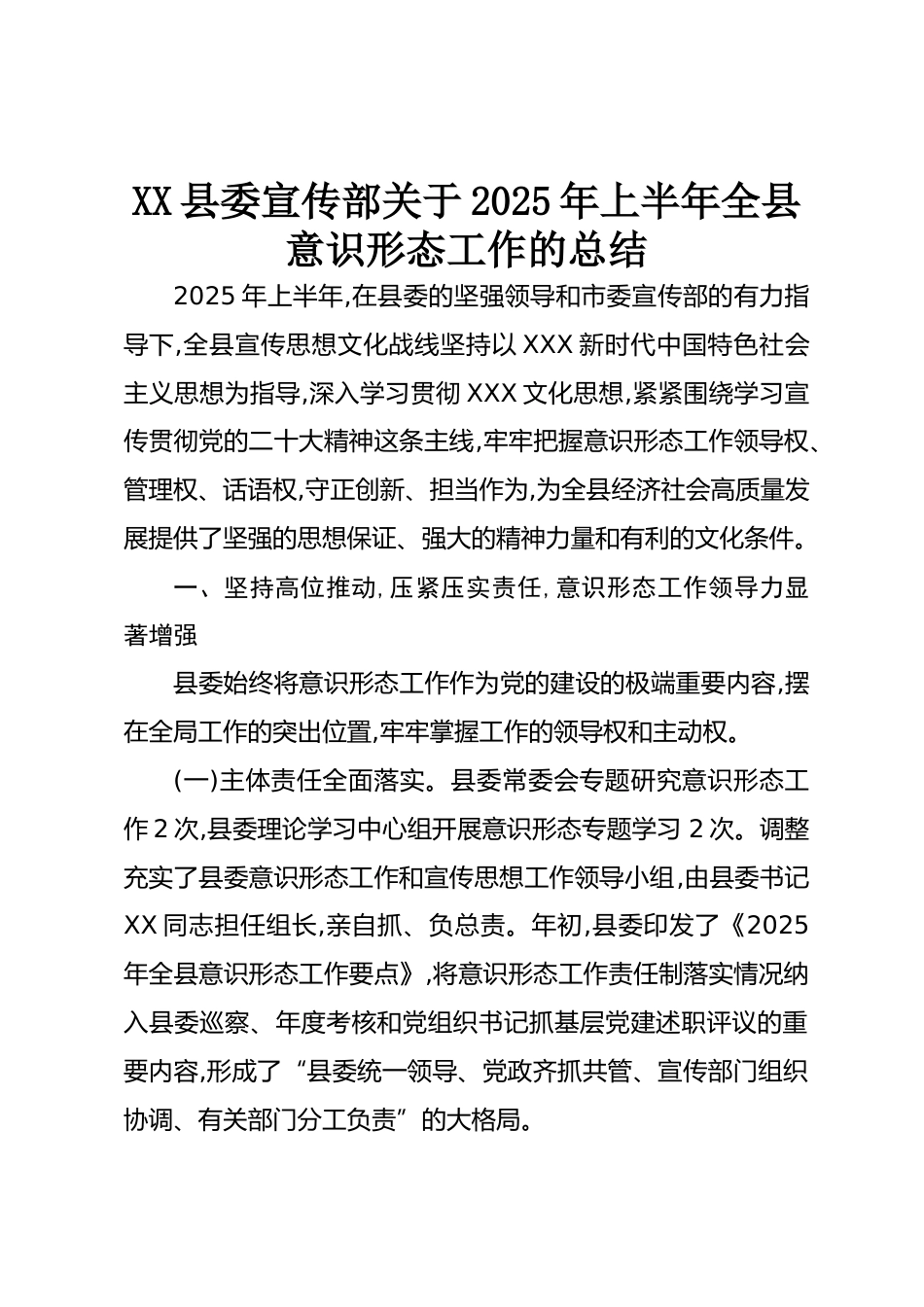 XX縣委宣傳部關(guān)于2025年上半年全縣意識形態(tài)工作的總結(jié)