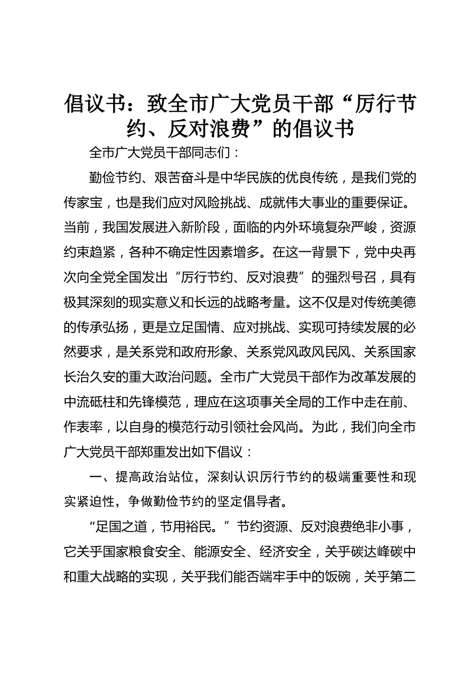 倡議書:致全市廣大黨員干部“厲行節(jié)約、反對(duì)浪費(fèi)”的倡議書VIP免費(fèi)