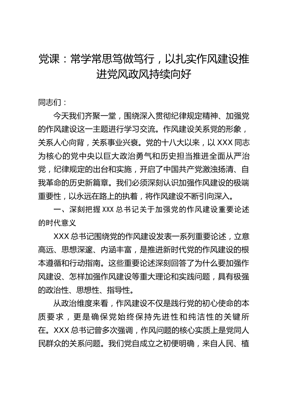 黨課:常學(xué)常思篤做篤行,以扎實作風(fēng)建設(shè)推進(jìn)黨風(fēng)政風(fēng)持續(xù)向好同志們:今天我們齊聚一堂,圍繞深入貫徹紀(jì)律規(guī)定精神、加強黨的作風(fēng)建設(shè)這一主題進(jìn)行學(xué)習(xí)交流。作風(fēng)建設(shè)關(guān)系黨的形象,關(guān)系人心向背,關(guān)系事業(yè)興衰。黨的十八大以來,以XXX同志為核心的黨中央以巨大政治勇氣和歷史擔(dān)當(dāng)推進(jìn)全面從嚴(yán)治黨,紀(jì)律規(guī)定的出臺和實施,開啟了中國共產(chǎn)黨激濁揚清、自我革命的歷史新篇章。我們必須深刻認(rèn)識加強作風(fēng)建設(shè)的極端重要性,以永遠(yuǎn)在路上的執(zhí)著,將作風(fēng)建設(shè)不斷引向深入。一、深刻把握XXX總書記關(guān)于加強黨的作風(fēng)建設(shè)重要論述的時代意義XXX總書記圍繞黨的作風(fēng)建設(shè)發(fā)表一系列...