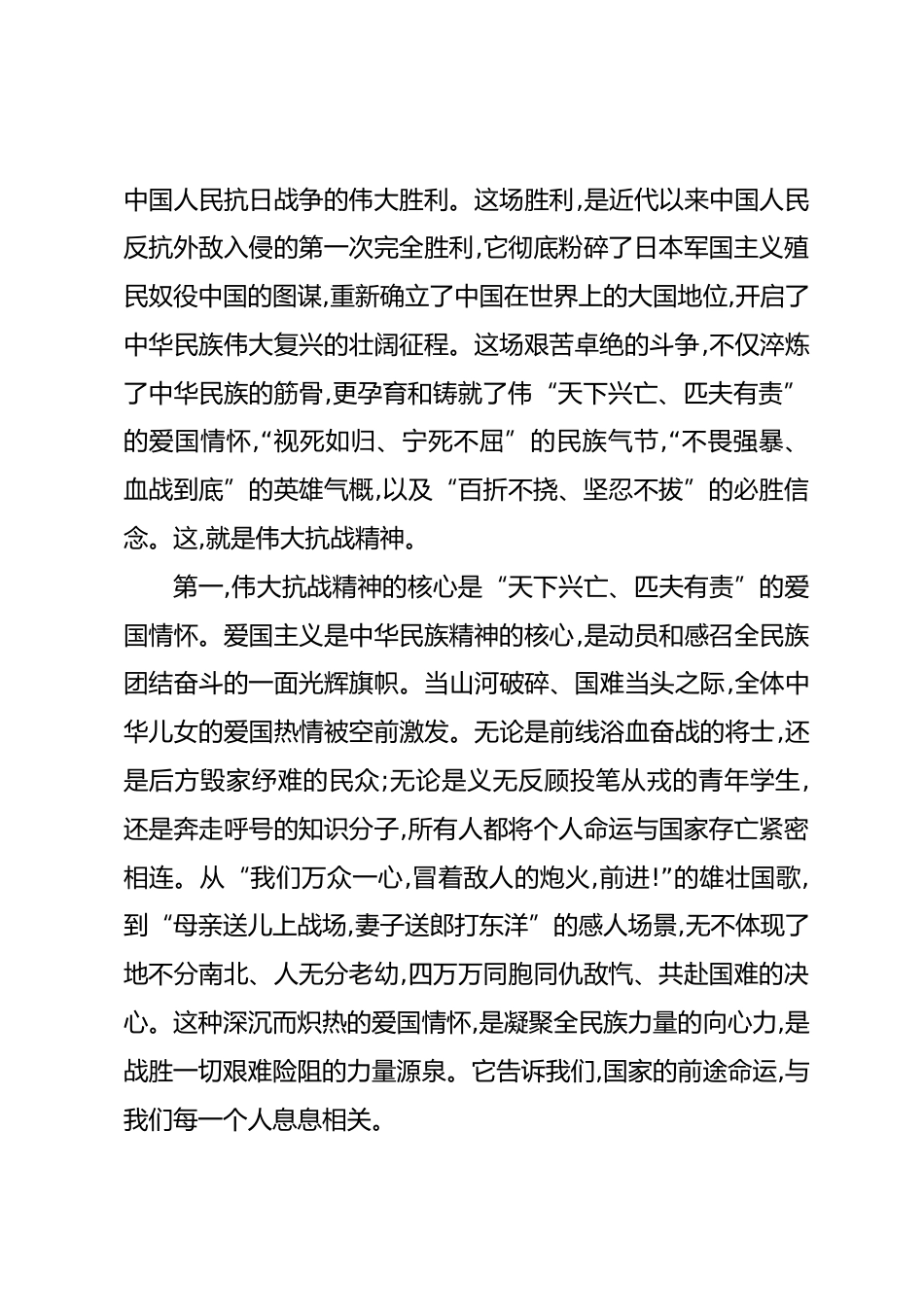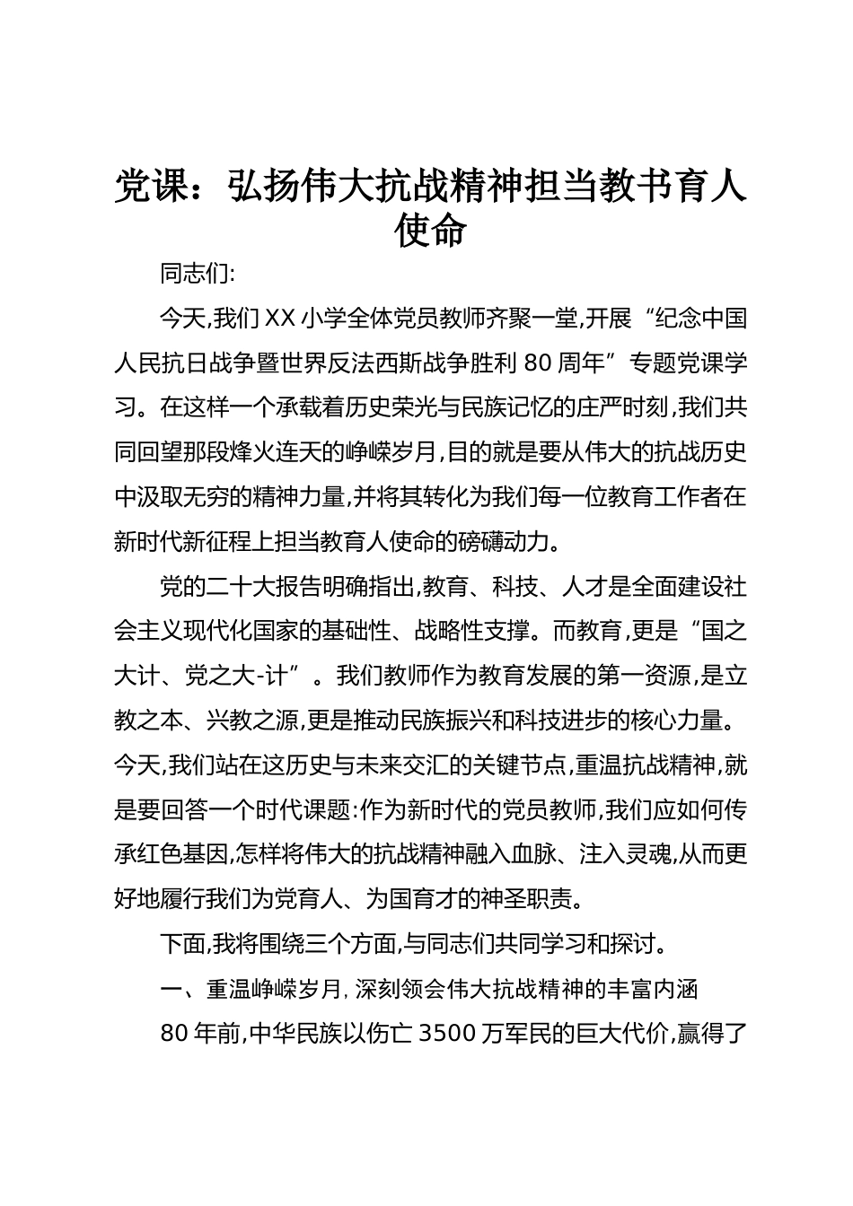 黨課:弘揚(yáng)偉大抗戰(zhàn)精神擔(dān)當(dāng)教書育人使命同志們:今天,我們XX小學(xué)全體黨員教師齊聚一堂,開展“紀(jì)念中國(guó)人民抗日戰(zhàn)爭(zhēng)暨世界反法西斯戰(zhàn)爭(zhēng)勝利80周年”專題黨課學(xué)習(xí)。在這樣一個(gè)承載著歷史榮光與民族記憶的莊嚴(yán)時(shí)刻,我們共同回望那段烽火連天的崢嶸歲月,目的就是要從偉大的抗戰(zhàn)歷史中汲取無窮的精神力量,并將其轉(zhuǎn)化為我們每一位教育工作者在新時(shí)代新征程上擔(dān)當(dāng)教育人使命的磅礴動(dòng)力。黨的二十大報(bào)告明確指出,教育、科技、人才是全面建設(shè)社會(huì)主義現(xiàn)代化國(guó)家的基礎(chǔ)性、戰(zhàn)略性支撐。而教育,更是“國(guó)之大計(jì)、黨之大-計(jì)”。我們教師作為教育發(fā)展的第一資源,是立教之本、興教之源,...