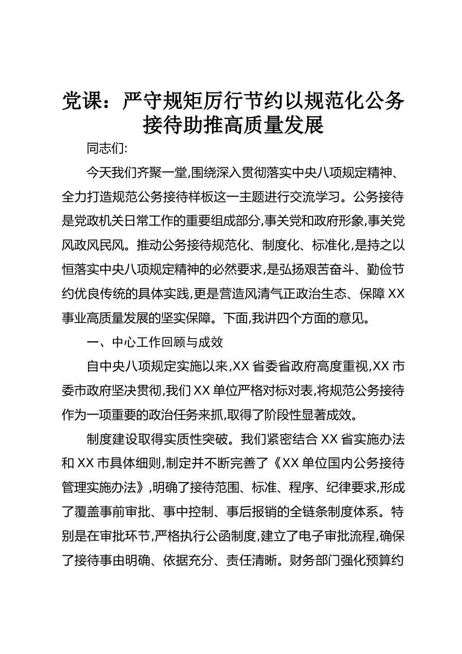 黨課:嚴(yán)守規(guī)矩厲行節(jié)約以規(guī)范化公務(wù)接待助推高質(zhì)量發(fā)展同志們:今天我們齊聚一堂,圍繞深入貫徹落實(shí)中央八項(xiàng)規(guī)定精神、全力打造規(guī)范公務(wù)接待樣板這一主題進(jìn)行交流學(xué)習(xí)。公務(wù)接待是黨政機(jī)關(guān)日常工作的重要組成部分,事關(guān)黨和政府形象,事關(guān)黨風(fēng)政風(fēng)民風(fēng)。推動(dòng)公務(wù)接待規(guī)范化、制度化、標(biāo)準(zhǔn)化,是持之以恒落實(shí)中央八項(xiàng)規(guī)定精神的必然要求,是弘揚(yáng)艱苦奮斗、勤儉節(jié)約優(yōu)良傳統(tǒng)的具體實(shí)踐,更是營(yíng)造風(fēng)清氣正政治生態(tài)、保障XX事業(yè)高質(zhì)量發(fā)展的堅(jiān)實(shí)保障。下面,我講四個(gè)方面的意見(jiàn)。一、中心工作回顧與成效自中央八項(xiàng)規(guī)定實(shí)施以來(lái),XX省委省政府高度重視,XX市委市政府堅(jiān)決貫徹,我們XX單...