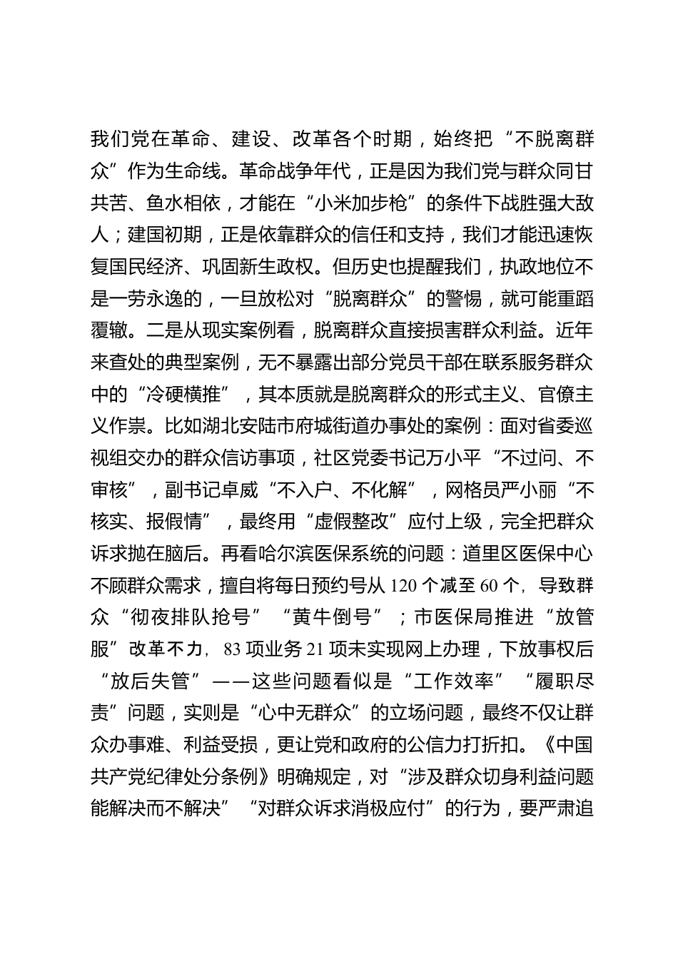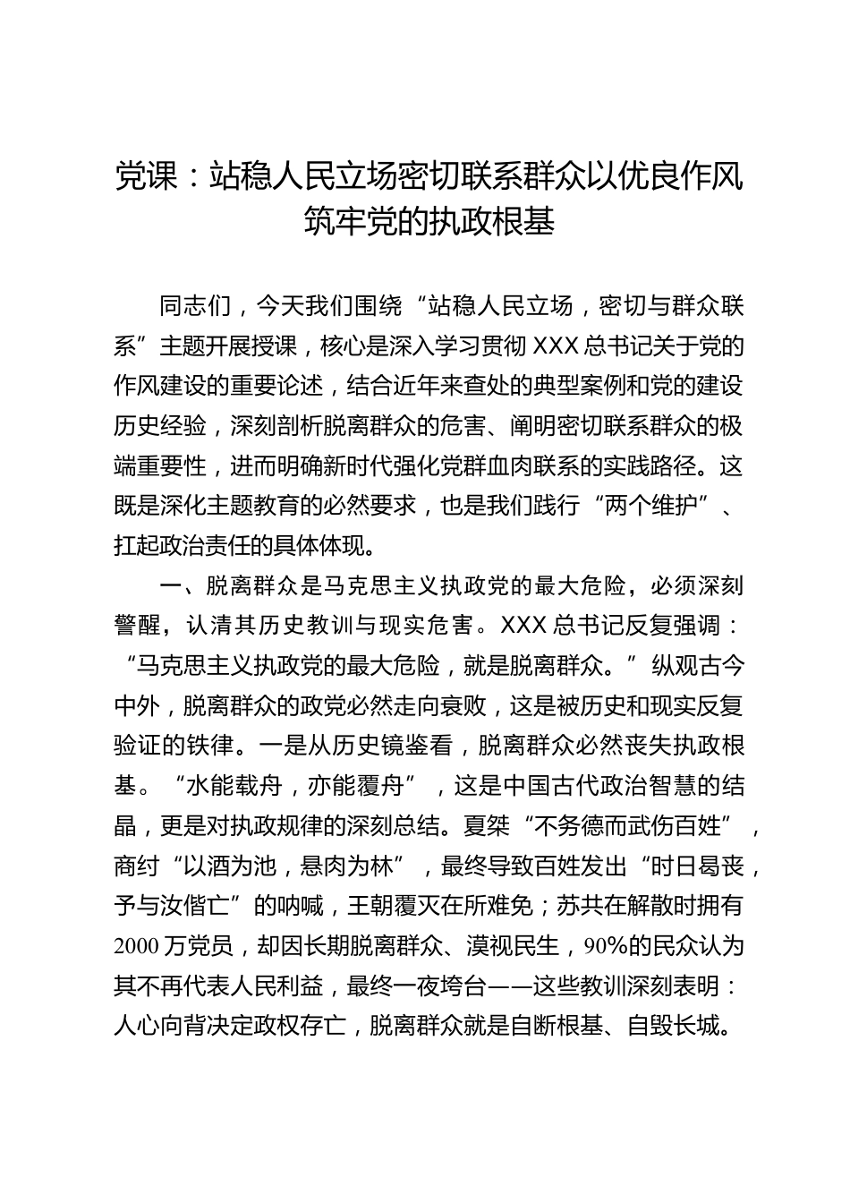 黨課:站穩(wěn)人民立場密切聯(lián)系群眾以優(yōu)良作風(fēng)筑牢黨的執(zhí)政根基同志們,今天我們圍繞“站穩(wěn)人民立場,密切與群眾聯(lián)系”主題開展授課,核心是深入學(xué)習(xí)貫徹XXX總書記關(guān)于黨的作風(fēng)建設(shè)的重要論述,結(jié)合近年來查處的典型案例和黨的建設(shè)歷史經(jīng)驗,深刻剖析脫離群眾的危害、闡明密切聯(lián)系群眾的極端重要性,進(jìn)而明確新時代強(qiáng)化黨群血肉聯(lián)系的實踐路徑。這既是深化主題教育的必然要求,也是我們踐行“兩個維護(hù)”、扛起政治責(zé)任的具體體現(xiàn)。一、脫離群眾是馬克思主義執(zhí)政黨的最大危險,必須深刻警醒,認(rèn)清其歷史教訓(xùn)與現(xiàn)實危害。XXX總書記反復(fù)強(qiáng)調(diào):“馬克思主義執(zhí)政黨的最大危險,就...